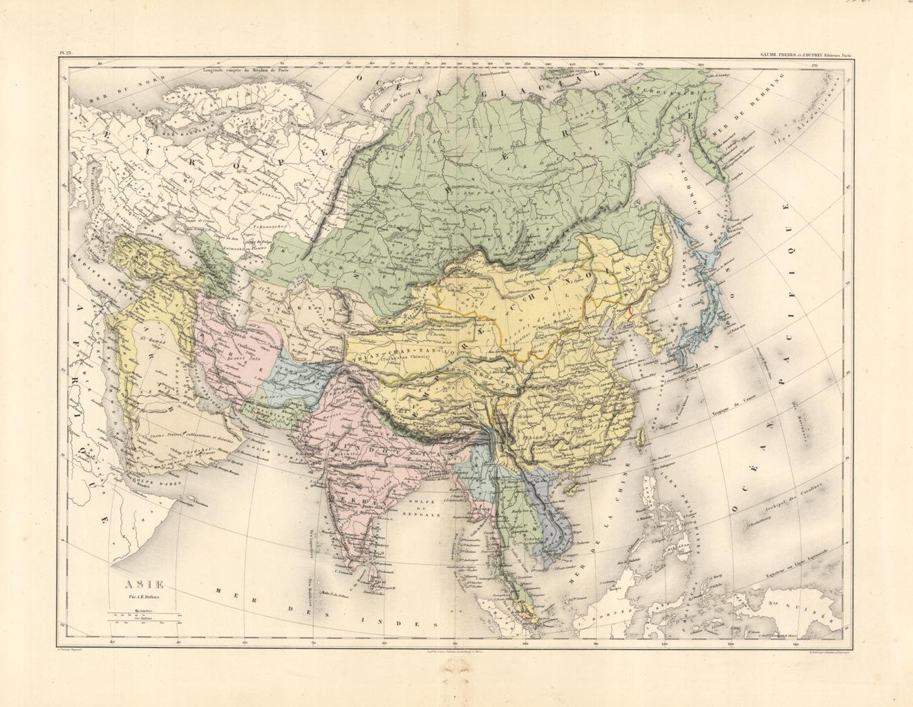 Carta geografica, antica ed originale, in coloritura coeva che rappresenta l'Asia. La mappa proviene dall'atlante geografico universale per servire la storia universale della chiesa cattolica. Autore: Dufour Auguste Henri 1795-1865. Luogo: Asia. Anno: 1861. Tecnica: litografia. Dimensioni: 430x570 il foglio. Piega editoriale