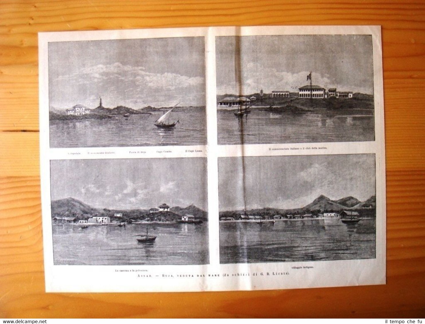 Rara Incisione Estratta da Rivista d'epoca del 1885 Assab: Buia vista dal mare L'Ospedale - Il Monumento Giulietti - Punta di Buja - Capo Combo Il Commissariato italiano e il club della Marina La Caserma e la polveriera Villaggio indigeno Dimensioni 33x25 II1885-060 Qualora vogliate delle scansioni migliori contattateci, soddisferemo ogni vostra richiesta. Paypal Carta di credito Bonifico bancario Accuratamente adagiate su un cartoncino e protette da pellicola trasparente rigida il tutto viene inserito dentro plico di adeguate dimensioni per proteggerne l'integrità