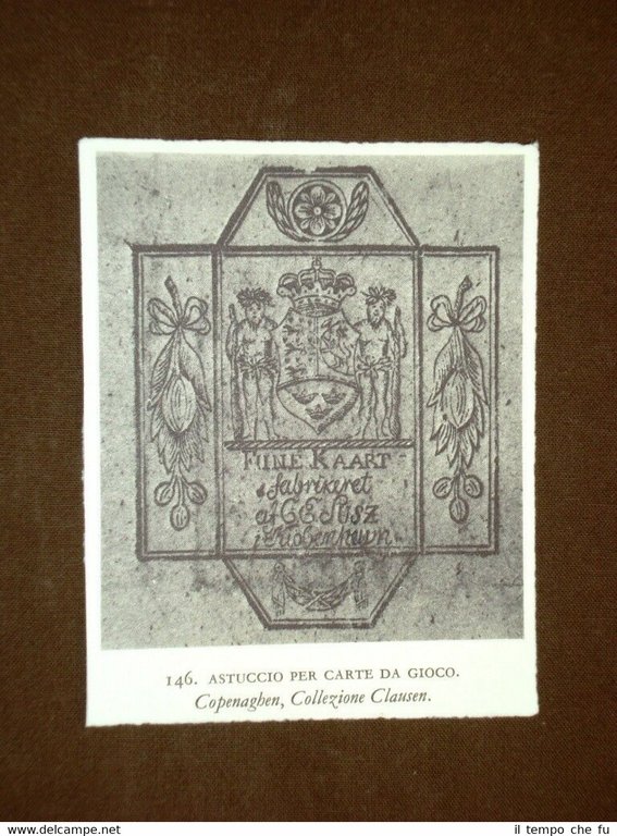 Stampa estratta da pubblicazione di metà '900 Astuccio per carte da gioco Collezione Clausen Copenaghen Arte popolare scandinava Svandinavia STAPO - 034 Dimensioni Cm 9,00 x 11,00 Qualora vogliate delle scansioni migliori contattateci, soddisferemo ogni vostra richiesta. Paypal Carta di credito Bonifico bancario Accuratamente adagiate su un cartoncino e protette da pellicola trasparente rigida, il tutto viene inserito dentro plico di adeguate dimensioni per proteggerne l'integrità.
