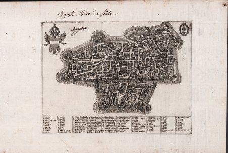 PRIMO STATO DELLA LASTRA, AVANTI IL TITOLO Pianta della città tratta da Heroico Splendore delle Città del Mondo, rarissima pubblicazione stampata per la prima volta a Roma nel 1639, e successivamente, ampliata con l’aggiunta di dieci nuove opere, nel 1642. In alto a destra lo stemma della città, a sinistra lo stemma imperiale di Ferdinando III Arciduca d’Austria. In basso, lungo il bordo e disposta su dieci colonne, una legenda numerica di 99 rimandi a luoghi cose e monumenti notabili. Nel secondo stato della lastra viene aggiunto il titolo in alto a sinistra AUGUSTA. La pianta deriva dal modello edito da Luca Guarinoni nel 1568, prima replica italiana della Ciuitatis Augustana olim Vindelica, hodie Rhetica, toto orbe terrarum notissima di Sebastian Münster, inserita nella sua Cosmographiae Universalis, edita a Basilea a partire dal 1544. Giacomo Lauro, fu incisore, stampatore e conoscitore di antichità attivo prevalentemente in ambito romano tra il 1583 e il 1645. Non si conosce la data e il luogo di nascita, ma il fatto che egli firmasse le sue opere come "Jacobus Laurus Romanus" lascia presumere che fosse originario di Roma. Nulla si conosce della sua formazione. La prima testimonianza documentaria che attesta la sua presenza a Roma, in cui è definito "intagliatore di rame romano", risale al 1583; mentre la sua prima stampa conosciuta è un Tiberio con la daga (o Il gladiatore), pubblicata da Claudio Duchetti nel 1585. Nonostante abbia affrontato tematiche storiche, mitologiche, devozionali, il Lauro è noto soprattutto per la produzione di piante e vedute di città, a cominciare dalla veduta a volo d'uccello di Rocca Contrada (Arcevia), realizzata nel 1594 per Angelo Rocca su disegno di Ercole Ramazzani. Negli anni 1630-45, Lauro si dedicò alla pubblicazione di una serie di piante e descrizioni di città italiane e straniere in forma di piccoli opuscoli, alcuni dei quali furono raccolti nel 1639 sotto il titolo di Heroico splendore delle città del mondo. Le piante di Lauro, dunque, furono il frutto di un lungo lavoro di ricerca, basato su fonti primarie, e pubblicato per la prima volta in libri o opuscoli con testo relativo alla storia della città. Scrive Thomas Ashby: “Negli anni 1630-1645 il Lauro pubblicò un numero rilevante di descrizioni di città in tanti opuscoli col testo, tutti in folio piccolo oblungo. Le piante non sono tutte originali […] Molte volte sono state adoperate come fonti, s’intende, le belle tavole dell’atlante del Lafrèry. Ma anche altre piante sono state messe sotto contributo - molto è stato preso o dall’opera di Braun e Hogenberg, Civitales Orbis Terrarum, oppure anche in questo caso da fonti comuni. Non mancano i contatti con Matteo Florimi di Siena, il quale in nessun caso compì di opera propria, ma copiò sempre i lavori degli altri. La pianta di Viterbo, finalmente, è derivata dalla pianta di Tarquinio Ligustri di Viterbo, fatta nel 1596 e dedicata al Cardinale Odoardo Farnese, Alcune di queste piante furono raccolte sotto il titolo seguente, inciso nel 1639; HEROICO SPLENDORE DELLE CITTA DEL MONDO LIBRO PRIMO DI IACOMO LAURO ROMANO Dove si uedono le piante di molte Citta Ill.ri e di molte non più state alla stampa con le loro origini et atti segnalati, et quanto si estende il dominio di esse sino alli presenti tempi in Roma l’Anno di nostra salute 1639” (cfr. Thomas Ashby, L'Heroico splendore delle città del mondo, in “La Bibliofilia”, XXXI (1929), pp. 105-122). L’opera venne ristampata nel 1642 con imprint in Roma l’Anno di nostra salute 1642 /Con priuilegio del somo Pontefice, et d'altri Potent.ti Con licenza de Superiori. Sebbene nel frontespizio si parli di “Libro primo” un secondo volume della raccolta non venne mia pubblicato. Incisione in rame, stampata su carta vergata coeva, con margini, leggerissime ossidazioni, per il resto in ottimo stato di conservazione. Rarissima. Bibliografia Ashby (1929): p. 118, n. 6; Cremonini. Map of the city taken from ' Heroico Splendore delle Città del Mondo, ' a very rare publication printed for the first time in Rome in 1639, and later, expanded with the addition of ten new works, in 1642. Giacomo Lauro, was an engraver, printer and connoisseur of antiquities active mainly in Rome between 1583 and 1645. We do not know the date and place of birth, but the fact that he signed his works as "Jacobus Laurus Romanus" suggests that he was a native of Rome. Nothing is known about his education. The first documentary evidence of his presence in Rome, in which he is defined as a "Roman copper engraver", dates back to 1583; while his first known print is a ' Tiberius with a dagger ' (or ' The Gladiator), published by Claudio Duchetti in 1585. Although he dealt with historical, mythological, devotional themes, Lauro is mainly known for the production of plans and views of cities, starting with the bird's eye view of Rocca Contrada (Arcevia), made in 1594 for Angelo Rocca on a drawing by Ercole Ramazzani. In the years 1630-45, Lauro dedicated himself to the publication of a series of maps and descriptions of Italian and foreign cities in the form of small pamphlets, some of which were collected in 1639 under the title of ' Heroico Splendore delle Città del Mondo. Lauro's plans, therefore, were the result of a long research work, based on primary sources, and published for the first time in books or pamphlets with text related to the history of the city. Thomas Ashby writes: "In the years 1630-1645 the Lauro published a considerable number of descriptions of cities in many pamphlets with text, all in small oblong folio. The plants are not all original [.] Many times have been used as sources, of course, the beautiful plates of the Atlas of Lafrèry. But other maps were also contributed - much was taken either from the work of Braun and Hogenberg, ' Civitales Orbis Terrarum, or even in this case from common sources. There is no lack of contact with Matteo Florimi of Siena, who i