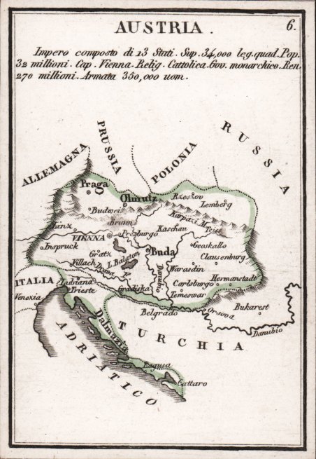 Rara mappa in miniatura tratta dal ' Piccolo Atlante per la Gioventù composte di 40 tavole geografiche con la descrizione delle Superficie, popolazioni, religioni, forma di governo, rendite, armate, ed altre notizie storico statistiche ' di Pietro e Giuseppe Vallardi, stampato a Milano, senza data, ma circa 1830. L'atlante consiste in un titolo e quaranta mappe stampate su carta spessa. Le carte sono divise in quattro serie: Europa, Asia, America e Africa; ogni set contiene nove mappe regionali dei paesi più importanti. Come dice il titolo, ogni mappa fornisce informazioni su geografia, popolazione, religione, governo, entrate e forza militare. Anche se l'atlante non è datato, una data approssimativa può essere accertata dalla mappa di Argentina e Uruguay. Sulla mappa l'Argentina è chiamata ' 'Confederazione del Rio della Plata'. Le Province Unite del Rio de la Plata era il nome iniziale per la nuova Argentina indipendente. Il nome fu abbandonato alla fine del terzo decennio in favore di Argentina. La mappa mostra anche un Uruguay indipendente, quindi dopo il Trattato di Montevideo del 1828. I Vallardi erano una famiglia di rinomati editori milanesi. Al capostipite Francesco (1736-1799) succedettero i figli Pietro, Santo Francesco, Giuseppe e Cesare Paolo. Nel 1812 rimasero in società Pietro (1770-1819) e Giuseppe (1784-1861), che intitolarono (1812) la ditta ai ' Fratelli Vallardi ' distinguendosi nella pubblicazione di libri e stampe d'arte. Dal 1818 Giuseppe, rimasto unico proprietario, diede grande impulso anche al commercio calcografico. Acquaforte, coloritura coeva dei contorni, in ottimo stato di conservazione. Rare miniature map taken from the ' Piccolo Atlante per la Gioventu composte di 40 tavole geografiche con la descrizione delle Superficie, popolazioni, religioni, forma di governo, rendite, armate, ed altre notizie storico statistiche ' by Pietro & Giuseppe Vallardi, published in Milan, circa 1830. The atlas consists of a title and forty maps each printed on thick card. The cards are divided into four sets: Europe, Asia, America, and Africa; with each set containing nine regional maps of the most prominent countries. As the title states, each map gives information upon the geography, population, religion, government, revenues and military strength. ' Although the atlas is not dated, an approximate date maybe ascertained from the map of Argentina and Uruguay. Upon the map Argentina is named the ' ?‘Confederazione del Rio della Plata’. The United Provinces of Rio de la Plata was an early name for the newly independent Argentina. The name was dropped by the end of the 1820s in favour of Argentina. The map also shows an independent Uruguay, which gained its independence at the Treaty of Montevideo in 1828. The Vallardis were a family of renowned Milanese publishers. The progenitor Francesco (1736-1799) was succeeded by his sons Pietro, Santo Francesco, Giuseppe, and Cesare Paolo. In 1812 Pietro (1770-1819) and Giuseppe (1784-1861) remained in partnership, naming (1812) the firm the ' Fratelli Vallardi, distinguishing themselves in the publication of art books and prints. From 1818 Giuseppe, who remained the sole owner, also gave great impetus to the intaglio trade. Etching, contemporary coloring of the outlines, in very good condition. Cfr.