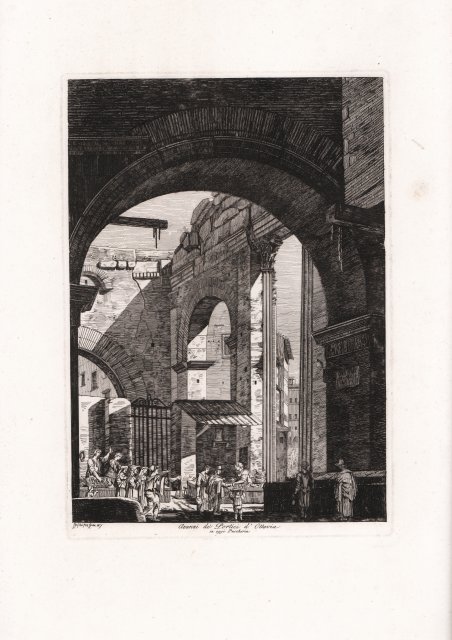 Veduta tratta dalla rara ' Raccolta di cinquanta principali vedute di antichità tratte dai scavi fatti in Roma in questi ultimi tempi. “L'opera è la riedizione di una precedente raccolta intitolata ' Frontespizio delle Antichità di Roma divise in 40 vedute ' edita nel 1817 alla quale Rossini aggiunge dieci nuove tavole. La presenza di alcune incisioni datate al 1819 induce a ritenere che l'effettiva pubblicazione dell'opera risalga a questa data piuttosto che al 1818, anno del frontespizio. Con questa raccolta Rossini esordisce nell'attività di incisore, dopo l'abbandono degli infruttuosi tentativi di affermarsi come architetto; nel 1830 ne rievocherà, nell'autobiografia, il discreto successo, pur considerandola opera di secondaria importanza, tanto da non menzionarla nei suoi cataloghi e da tralasciarla nella ristampa delle sue raccolte, personalmente curata nel 1856. Tuttavia, le vedute di antichità presentano non pochi motivi di interesse documentario per la storia dei lavori di scavo e di restauro intrapresi nella città fra l'occupazione francese e i primi anni della restaurazione. In particolare, attraverso le tavole relative al Foro Romano e ai suoi monumenti vengono documentati i lavori alle pendici del Campidoglio per l'isolamento dei templi di Vespasiano e di Saturno; i primi interventi intorno all'Arco di Settimio Severo, lo scavo promosso dalla Duchessa di Devonshire alla Colonna di Foca e lo sterro del basamento delle colonne del Tempio dei Castori. Delle grandi trasformazioni urbanistiche previste dall'Amministrazione francese, l'opera documenta l'isolamento del tempio di Vesta e l'inizio dei lavori a Piazza del Popolo. In queste prime tavole, se da un lato è evidente una certa immaturità compositiva e tecnica, dall'altro è già presente quella che poi sarà una delle costanti del Rossini: l'accuratezza e la precisione dell'esposizione finalizzata all'intento documentario, che probabilmente gli derivano dal suo tirocinio di architetto e disegnatore. La costruzione dell'immagine si avvale di schemi già collaudati ed è organizzata secondo linee semplificate che tendono a contrarre lo spazio verso il primo piano. L'inquadratura è generalmente frontale e colta dal basso verso l'alto, mentre la riduzione del campo visivo evita la necessità di articolare diversi piani in successione; anche i pochi esemplari in diagonale o a veduta panoramica non si sottraggono a questi limiti. Non sfugge ad una certa elementarità neppure il gioco luministico costituito da netti contrasti di luci ed ombre ottenuti impiegando probabilmente una sola morsura che non permette la resa di gradualità tonali. Anche il segno, duro e schematico, condotto secondo linee rette e parallele, di derivazione architettonica, tende ad accentuare l'effetto di rigidezza. Nell'esecuzione delle figure, fuori scala rispetto al monumento, già si riconosce, in alcune tavole, la maniera di Bartolomeo Pinelli. Dell'opera esistono alcuni disegni preparatori, raccolti nell'Album di 52 vedute acquerellate e 27 disegni a matita di fregi e capitelli antichi, conservato nella biblioteca Civica di Forli” (cfr. ' M. E. Tittoni in ' Luigi Rossini incisore, ' p. 42). Acquaforte, leggere ossidazioni nei margini, per il resto in ottimo stato di conservazione. Bibliografia M. E. Tittoni in ' Luigi Rossini incisore, Vedute di Roma 1817-1850, ' pp. 42-53. View taken from the rare early work by Rossini, entitled ' Frontespizio delle antichità di Roma divise in 40 vedute disegnate dal vero dall'architetto Luigi Rossini e da esso incise nel 1817. “L'opera è la riedizione di una precedente raccolta intitolata ' Frontespizio delle Antichità di Roma divise in 40 vedute ' edita nel 1817 alla quale Rossini aggiunge dieci nuove tavole. La presenza di alcune incisioni datate al 1819 induce a ritenere che l'effettiva pubblicazione dell'opera risalga a questa data piuttosto che al 1818, anno del frontespizio. Con questa raccolta Rossini esordisce nell'attività di incisore, dopo l'abbandono degli infruttuosi tentativi di affermarsi come architetto; nel 1830 ne rievocherà, nell'autobiografia, il discreto successo, pur considerandola opera di secondaria importanza, tanto da non menzionarla nei suoi cataloghi e da tralasciarla nella ristampa delle sue raccolte, personalmente curata nel 1856. Tuttavia, le vedute di antichità presentano non pochi motivi di interesse documentario per la storia dei lavori di scavo e di restauro intrapresi nella città fra l'occupazione francese e i primi anni della restaurazione. In particolare, attraverso le tavole relative al Foro Romano e ai suoi monumenti vengono documentati i lavori alle pendici del Campidoglio per l'isolamento dei templi di Vespasiano e di Saturno; i primi interventi intorno all'Arco di Settimio Severo, lo scavo promosso dalla Duchessa di Devonshire alla Colonna di Foca e lo sterro del basamento delle colonne del Tempio dei Castori. Delle grandi trasformazioni urbanistiche previste dall'Amministrazione francese, l'opera documenta l'isolamento del tempio di Vesta e l'inizio dei lavori a Piazza del Popolo. In queste prime tavole, se da un lato è evidente una certa immaturità compositiva e tecnica, dall'altro è già presente quella che poi sarà una delle costanti del Rossini: l'accuratezza e la precisione dell'esposizione finalizzata all'intento documentario, che probabilmente gli derivano dal suo tirocinio di architetto e disegnatore. La costruzione dell'immagine si avvale di schemi già collaudati ed è organizzata secondo linee semplificate che tendono a contrarre lo spazio verso il primo piano. L'inquadratura è generalmente frontale e colta dal basso verso l'alto, mentre la riduzione del campo visivo evita la necessità di articolare diversi piani in successione; anche i pochi esemplari in diagonale o a veduta panoramica non si sottraggono a questi limiti. Non sfugge ad una certa elementarità neppure il gioco luministico costituito da netti contrasti di luci ed ombre o