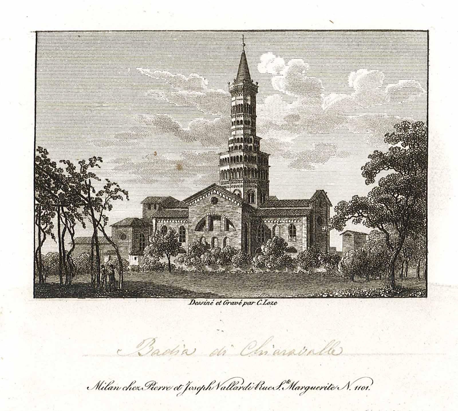 Veduta dell'Abbazia di Chiaravalle. Titolo manoscritto con inchiostro bruno.