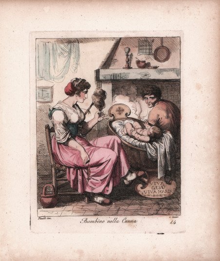 Costume popolare tratto dalla ' Nuova Raccolta di cinquanta motivi pittoreschi e costumi di Roma, 1810. Rara e bella serie, la seconda prodotta dall'artista, raffigurante costumi popolari singoli e in gruppo, scene e mestieri non solo di Roma e dintorni, ma anche di Campania, Calabria e Abruzzi. Stampatore, pittore, scultore e disegnatore italiano. Apprese i rudimenti della scultura dal padre, artigiano di piccole statuette religiose di scarso valore. Questo apprendistato in tenera età incoraggiò Pinelli ad enfatizzare la plasticità e l’espressione rispetto ai valori del Neo-Classicismo, predominanti a Roma. Purtroppo, sono pervenute fino a noi solo pochi esemplari delle sue sculture in terracotta, mentre conosciamo il volume di acqueforti, Gruppi pittoreschi (Roma, 1834), con rappresentazioni di popolani. L’enfasi sul naturalismo e su soggetti di vita quotidiana è di nuovo evidente. Sebbene avesse studiato presso l’Accademia di Belle Arti a Bologna, sostenuto economicamente dal Conte Lambertini, il nipote di Papa Benedetto XIV, Pinelli non aveva interesse a seguire l'iter tradizionale del successo artistico attraverso i soggetti religiosi. Di ritorno a Roma, alla fine del XVIII secolo, decise di vendere le sue opere nei caffè frequentati dai turisti. ' Incisione in rame, finemente colorata a mano, in ottimo stato di conservazione. Popular costume from ' Nuova Raccolta di cinquanta motivi pittoreschi e costumi di Roma, 1810. Rare and beautiful series, the second produced by the artist, depicting individual and group popular costumes, scenes and crafts not only of Rome and its surroundings, but also of Campania, Calabria and Abruzzi. Italian printmaker, painter, sculptor and draughtsman. He learnt the rudiments of sculpture from his father, a maker of cheap religious statuettes. This early training encouraged Pinelli to emphasize plasticity and expression over the Neo-classical values prevalent in Rome. Although only a few of his terracotta figures survive however, he did produce a volume of etchings, Gruppi pittoreschi (Rome, 1834), depicting rustic groups. Its emphasis on naturalism and everyday subject-matter is also characteristic of his sculptures. Although he studied both at the Accademia di San Luca in Rome and at the Accademia di Belle Arti in Bologna, helped financially by Conte Lambertini, Pope Benedict XIV’s nephew, Pinelli was not interested in pursuing the traditional path to artistic success via religious or history painting. On returning to Rome in the late 1790s he chose to peddle his works at the cafés frequented by tourists. Copperplate, finely hand coloured, in excellent condition. Cfr.