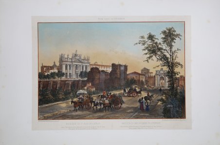 Veduta tratta dalla monumentale opera di Felix Benoist ' Rome dans sa grandeur. Vues, monument ancient et modernes ' stampata a Parigi in 3 volumi, da Henri Charpentier, nel 1870. La pubblicazione, illustrata da 100 litografie, fu preceduta da una campagna di disegni preparatori, a far data dal 1864 sino al 1869, eseguita soprattutto da Félix Benoist e in parte da Philippe Benoist. Alla vigilia del Concilio Ecumenico Vaticano I, l’11 agosto 1869, Pio IX decretava la realizzazione di una ' Esposizione romana delle opere d’ogni arte eseguite per il culto cattolico, che venne inaugurata, il 17 febbraio 1870, nel chiostro della Certosa di Santa Maria degli Angeli. In quell’occasione, vennero presentati i tre volumi in folio ' Rome dans sa grandeur. I volumi, rilegati in modo sfarzoso, con impresso al centro in oro, lo stemma di Pio IX, sono suddivisi in tre sezioni. Il primo volume tratta di ' Roma antica, il secondo, di ' Roma cristiana, ed il terzo, dei monumenti e le realizzazioni della ' Roma moderna. Una visione preziosa della Roma papale alla vigilia della profonda trasformazione di Roma in capitale dell’Italia unita. Un documento che evidenzia la notevole impronta lasciata da Pio IX nella Città Eterna. L’opera rappresenta il capolavoro dell’artista francese, dove ogni veduta è realizzata in litografia tinta, processo ottenuto usando un diverso numero di pietre. Il risultato è un’opera di grande effetto, tanto da porre il Benoist tra la schiera dei più grandi artisti di interni e vedute del suo tempo. Litografia tinta, finemente colorata a mano, in ottimo stato di conservazione. View taken from the monumental work of Felix Benoist ' Rome dans sa grandeur. Vues, monument ancient et modernes ' printed in Paris in 3 volumes, by Henri Charpentier, in 1870. The publication, illustrated by 100 lithographs, was preceded by a campaign of preparatory drawings, from 1864 to 1869, executed mainly by Felix Benoist and partly by Philippe Benoist. On the eve of the First Vatican Ecumenical Council, August 11, 1869, Pius IX decreed the creation of the ' Esposizione romana delle opere d’ogni arte eseguite per il culto cattolico ' (a Roman Exhibition of the works of art created for Catholic worship), which was inaugurated on February 17, 1870, in the cloister of the Charterhouse of Santa Maria degli Angeli. On that occasion, the three volumes in folio ' Rome dans sa grandeur ' were presented. The volumes, magnificently bound, with the coat of arms of Pius IX stamped in gold in the center, are divided into three sections. The first volume deals with ancient Rome, the second with “Christian” Rome, and the third with the monuments and achievements of modern Rome. A precious vision of papal Rome on the eve of the profound transformation of Rome into the capital of united Italy. A document that highlights the remarkable imprint left by Pius IX in the Eternal City. The work represents the masterpiece of the French artist, where each view is made in tinted lithography, a process achieved by using a different number of stones. The result is a work of great effect, so much so as to place Benoist among the ranks of the greatest artists of interiors and views of his time. Tinted lithograph, finely hand-colored, in excellent condition. Cfr.