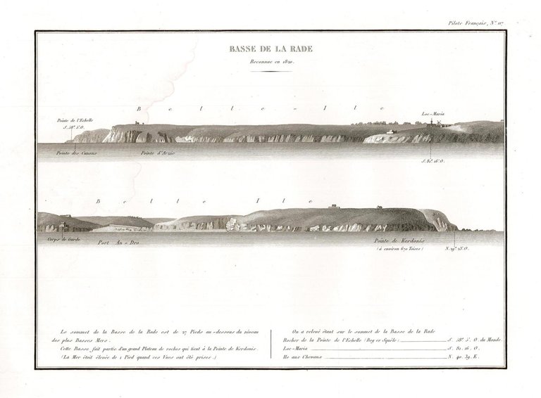 Incisione, antica ed originale, raffigurante le coste ovest della Francia nel litorale del sud della Bretagna. Si nota in particolare: Bele Ile, Pointe de l'Eschelle, Loc Maria, Point de Kerdonis. Inserita nell’opera di Beautemps Beaupré Charles François (considerato il padre della idrografia moderna) “Pilote français. deuxième partie, comprenant les côtes occidentales de France depuis la pointe de Penmarc'h jusqu'à l'île d'Yeu, levées en 1819, 1820, 1821, et 1822 Par les Ingegneurs Hydrographes de la Marine. Sous les Ordes de Beautemps Beaupré. “ Edita a [Parigi] nel 1829