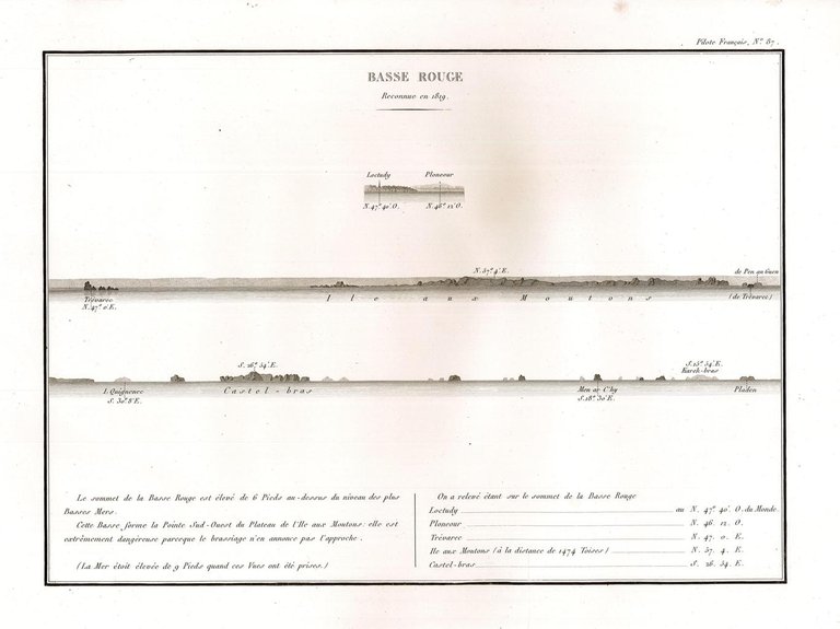 Incisione, antica ed originale, raffigurante le coste del nord-ovest della Francia nel litorale della Bretagna nei pressi di Brest. Inserita nell’opera di Beautemps Beaupré Charles François (considerato il padre della idrografia moderna) “Pilote français, (environs de Brest) / Rédigé / Par M. Beautemps Beaupré Ingénieur Hydrographe en Chef de la Marine, / Membre de l’Académie Royale des Sciences de l’Institut de France… / Publié par ordre du Roi / Sous me Ministère de Son Excellence M.le Marquis de Clermont Tonnerre /.“ Edita a [Parigi]