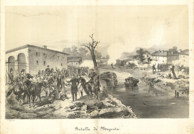 Raffigurazione della battaglia di Magenta, l'ultima battaglia per la liberazione austriaca combattuta il 4 giugno del 1859. Pochi giorni dopo Vittorio Emanuele II e l'imperatore francese entrarono vincitori a Milano. Con ogni probabilità la stampa ritrae il momento in cui il Generale Espinasse venne colpito nei pressi di Casa Giacobbe. La litografia è stampata su fondo seppia e presenta un evidente restauro ad uno strappo nel cielo in alto a sinistra. Rara edizione spagnola, piega editoriale centrale