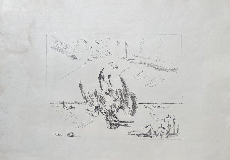 Il soggetto è delimitato da una delicata linea di contorno. Come in un sogno o in un racconto incompiuto, si trovano assemblati diversi elementi: al centro un beccaccino, alle sue spalle una spiaggia con una gondola, nel cielo delle figure difficilmente leggibili. Malabotta riferisce di una tiratura di 60 esemplari, numerata e datata 1945, stampata a Venezia presso Carlo Cardazzo, più 12 esemplari colorati a mano. Esemplare non firmato e non numerato impresso su carta con frammento di filigrana P M Fabriano, tiratura successiva probabilmente tratta dalla cartella: Le litografie di de Pisis. Testo di Giuseppe Marchiori, Verona, Le Edizioni del Galeone 1969.