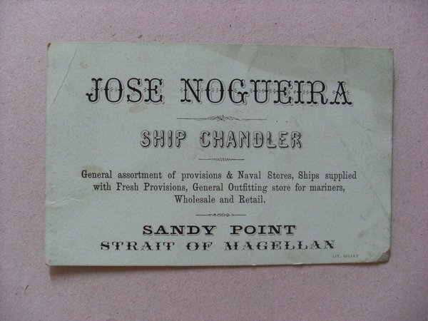 Biglietto pubblicitario JOSE NOGUEIRA Ship Chandler - Sandy Point - Strait of Magellan