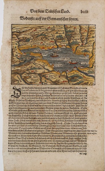Tavola tratta dalla ' Cosmographiae Universalis, edizione in tedesco, Basilea, seconda metà del XVI secolo.La ' Cosmographiae Universalis ' di Sebastian Münster (1488-1552), stampata per la prima volta Basilea nel 1544 dall’editore Heinrich Petri, venne più volte aggiornata e aumentata di nuove carte geografiche e rappresentazioni urbane nelle sue numerose edizioni che arrivano all’inizio del secolo successivo. Münster aveva lavorato a raccogliere informazioni al fine di ottenere un'opera che non deludesse le aspettative e, dopo un'ulteriore pubblicazione in tedesco abbellita da 910 stampe su legno, giunse nel 1550 all'edizione definitiva in latino, illustrata da 970 silografie. Vi furono poi numerose edizioni in diverse lingue, fra cui latino, francese, italiano, inglese e ceco. Dopo la sua morte di Münster (1552), Heinrich Petri prima, e il figlio Sebastian poi, continuarono la pubblicazione dell’opera. La ' Cosmographia universalis ' fu uno dei libri più popolari e di successo del XVI secolo, e vide ben 24 edizioni in 100 anni: l'ultima edizione tedesca venne pubblicata nel 1628, molto tempo dopo la morte dell'autore. La ' Cosmographia ' conteneva non solo le ultime mappe e vedute di tutte le città più famose, ma anche una serie di notizie enciclopediche di dettagli relative al mondo conosciuto, e sconosciuto. Il particolare successo anche commerciale di quest'opera fu dovuto in parte alle belle incisioni (tra i cui autori si possono citate Hans Holbein il Giovane, Urs Graf, Hans Rudolph Manuel Deutsch, David Kandel). Silografia, bella coloritura a mano, in buone condizioni. Plate taken from the ' Cosmographiae Universalis, German edition, Basel, second half of the 16th Century. The ' Cosmographiae Universalis ' of Sebastian Münster (1488-1552), printed for the first time in Basel in 1544 by the publisher Heinrich Petri, was updated several times and increased with new maps and urban representations in its many editions until the beginning of the next century. Münster had worked to collect information in order to obtain a work that did not disappoint expectations and, after a further publication in German embellished with 910 woodblock prints, arrived in 1550 to the final edition in Latin, illustrated by 970 woodcuts. There were then numerous editions in different languages, including Latin, French, Italian, English and Czech. After his death in Münster (1552), Heinrich Petri first, and then his son Sebastian, continued the publication of the work. The ' Cosmographia universalis ' was one of the most popular and successful books of the 16th century, and saw as many as 24 editions in 100 years: the last German edition was published in 1628, long after the author's death. The ' Cosmographia ' contained not only the latest maps and views of all the most famous cities, but also a series of encyclopedic details related to the known, and unknown, world. The particular commercial success of this work was due in part to the beautiful engravings (among whose authors can be mentioned Hans Holbein the Younger, Urs Graf, Hans Rudolph Manuel Deutsch, David Kandel). Woodcut, beautiful hand-coloring, in good condition. Cfr.
