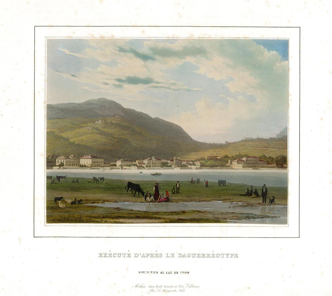 Veduta del quartiere di Borgo di Vico ripresa dal Prato Pasquee nelle vicinanze della foce del fiume Cosia. Il primo piano è animato dalla presenza di alcuni personaggi, caprette e mucche al pascolo. L'immagine conserva uno straordinario spaccato di vita quotidiana di una di quelle zone che saranno completamente modificate dall'evoluzione della città di Como. In secondo piano si riconoscono le ville: Saporiti, Bellotti, D'adda sino alla prestigiosa Villa Raimondi, oggi Villa Olmo. L'incisione è impreziosita da una vivace coloritura coeva all'acquerello, rifilata ai margini ed applicata su cartoncino editoriale. Quest'ultimo, sotto l'incisione, conserva l'elenco delle vedute della stessa serie , "Exécuté d'Aprés le Daguerréotype", pubblicate da Artaria a Milano. Assai rara a reperirsi nelle presenti condizioni.