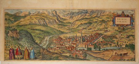 Veduta di Bressanone secondo un disegno di Georg Hoefnagel. Bressanone (in tedesco Brixen), situata in una valle alla confluenza della Rienza e dell'Isarco, è vista da un punto panoramico di montagna a ovest-sud-ovest della città. L'ampio ponte che attraversa l'Isarco conduce alla chiesa parrocchiale di San Michele, con la sua guglia appuntita a est, di fronte al presbiterio. A sinistra si trova la più piccola cattedrale del XII secolo. Questa vista da est mostra Lauingen, nota per i suoi artigiani, come indicano le figure in primo piano. I fili di stoffa stesi a sbiancare sui prati alludono all'artigianato della tessitura, che era un'importante fonte di reddito per la città. ' L’opera è inserita nel ' Civitates Orbis Terrarum, il primo atlante devoto esclusivamente alle piante e vedute delle principali città del mondo. Il primo volume delle Civitates Orbis Terrarum fu pubblicato a Colonia nel 1572. Il sesto e ultimo volume apparve nel 1617. Questo grande atlante di città – cartografia urbana - curato da Georg Braun e inciso in gran parte da Franz Hogenberg, conteneva 546 prospettive, vedute a volo d'uccello e vedute cartografiche di città di tutto il mondo. Franz Hogenberg realizzò le tavole dei primi quattro volumi e Simon van den Neuwel (Novellanus, attivo dal 1580) quelle dei volumi V e VI. Georg Braun (1541-1622), un ecclesiastico di Colonia, fu il principale redattore dell'opera e fu molto aiutato nel suo progetto dalla vicinanza e dal continuo interesse di Abraham Ortelius, il cui Theatrum Orbis Terrarum del 1570 fu, come raccolta sistematica e completa di mappe di stile uniforme, il primo vero atlante. Le Civitates, in effetti, erano destinate ad accompagnare il Theatrum, come indicato dalla somiglianza dei titoli e dai riferimenti contemporanei sulla natura complementare delle due opere. Tuttavia, le Civitates erano progettate per avere un approccio più popolare, senza dubbio perché la novità di una raccolta di piante e vedute di città rappresentava un'impresa commerciale più rischiosa di un atlante mondiale, per il quale c'erano stati diversi precedenti di successo. Franz Hogenberg (1535-1590) era figlio di un incisore di Monaco che si era stabilito a Malines. Incise la maggior parte delle tavole del Theatrum di Ortelius e la maggior parte di quelle delle Civitates, e potrebbe essere anche indicato come il responsabile dell'origine del progetto. Oltre un centinaio di artisti e cartografi diversi, il più importante dei quali fu l'artista di Anversa Georg Hoefnagel (1542-1600), fornirono i disegni per le tavole delle Civitates. Hoefnagel non solo contribuì alla maggior parte del materiale originale per le città spagnole e italiane, ma rielaborò e modificò anche quello di altri collaboratori. Dopo la morte di Hoefnagel, il figlio Jakob continuò il lavoro per le Civitates. Gli autori della raccolta si proponevano di raffigurare "non icones et typi urbium", cioè non immagini generiche e tipizzate, "sed urbes ipsae admirabili caelaturae artificio, spectantium oculis subiectae appareant": non intendeva alludere o idealizzare, ma rappresentare fedelmente sulla carta, riprodurre esattamente, e in tempo reale, ciò che l'occhio vede, come annunciato nella prefazione al primo volume delle Civitates Orbis Terrarum. Incisione in rame, bella coloritura coeva, in ottimo stato di conservazione. View of Bressanone ater a drawing by Georg Hoefnagel. Bressanone (in German Brixen), which is situated in a valley at the confluence of the Rienza and the Isarco, is seen from a mountain vantage point west-southwest of the city. The wide bridge spanning the Isarco leads to the parish church of St Michael with its pointed spire in the east abutting the chancel. To the left of it is the smaller 12th-century cathedral. ' This view from the east shows Lauingen, which is known for its artisans, as the figures in the foreground indicate. The bolts of cloth laid out to bleach on the meadows allude to the craft of weaving, which was an important source of income for the town. ' The work is included in the ' Civitates Orbis Terrarum, the first atlas devoted exclusively to plans and views of the world's major cities. Printed in six volumes between 1572 and 1617 it was so successful and widespread that several editions translated into Latin, German and French were printed. The first volume of the Civitates Orbis Terrarum was published in Cologne in 1572. The sixth and the final volume appeared in 1617. This great city atlas, edited by Georg Braun and largely engraved by Franz Hogenberg, eventually contained 546 prospects, bird-eye views and map views of cities from all over the world. Fransz Hogenberg produced the plates for the first four books, and Simon van den Neuwel (Novellanus, active since 1580) those for volumes V and VI. Georg Braun (1541-1622), a cleric of Cologne, was the principal editor of the work, and was greatly assisted in his project by the close, and continued interest of Abraham Ortelius, whose Theatrum Orbis Terrarum of 1570 was, as a systematic and comprehensive collection of maps of uniform style, the first true atlas. The Civitates, indeed, was intended as a companion for the Theatrum, as indicated by the similarity in the titles and by contemporary references regarding the complementary nature of two works. Nevertheless, the Civitates was designs to be more popular in approach, no doubt because the novelty of a collection of city plans and views represented a more hazardous commercial undertaking than a world atlas, for which there had been a number of successful precedents. Franz Hogenberg (1535-1590) was the son of a Munich engraves who settled in Malines. He engraved most of the plates for Ortelius's Theatrum and the majority of those in the Civitates, and may have been responsible for originating the project. Over a hundred of different artists and cartographers, the most significant of whom was Antwerp artist Georg Hoefnagel (1542-1600), engraved the cooper-pl