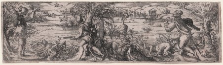 Acquaforte su ferro, monogrammata in lastra in basso al centro. Della serie "Otto scene di caccia" pubblicata da Stefan Herman ad Ansbach.Magnifica prova, ricca di toni, impressa su carta vergata coeva, rifilata al rame, in ottimo stato di conservazione. Rara. The duck hunt, landscape background. Etching on iron, form the set of "Eight Hunting scenes" published by Stefan Herman, Absbach 1590 circa.Very good condition. Cfr. New Hollstein (German) e.147 (Jost Amman); Andresen 1868 I.148.86; Bartsch IX.357.8.