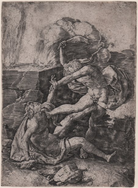 Bulino, 1529, monogrammato e datato in lastra, sulla pietra al centro in basso. Quinta tavola di sei della serie “Storie di Adamo ed Eva”, tutte pubblicate nel 1529. Esemplare del primo stato di tre descritto da Hollstein, prima dell'indirizzo di M. Petri (Peeters); una seconda variante (Hollstein Ib) con lievi macchie e graffi che si vedono sulla lastra. La scena è basata sulla Genesi 4:8: Caino, geloso del fratello Abele, lo uccide. Alle loro spalle, i fuochi accesi per le loro offerte stanno ancora bruciando. Bellissima prova, impressa su carta vergata coeva, rifilata alla linea marginale, in ottimo stato di conservazione. Bibliografia New Hollstein (Dutch & Flemish) / The New Hollstein: Dutch and Flemish etchings, engravings and woodcuts 1450-1700 (5.Ib); Bartsch / Le Peintre graveur (VII.340.5). Cain Killing Abel; Abel is forced to the ground by Cain whose right foot pushes against Abel's chest; Abel raises his left arm to defend himself while Cain brandishes a jawbone in his right hand above his head; two fires burn on the stone altar to the left. Engraving, 1529, lettered with the date 1529 and letter "L" in reverse on a rock in the center foreground. Example of the first state of three described by Hollstein, before the address of M. Petri (Peeters); a second issue (Ib) with minor spots and schratches. The fifth in a series of six plates depicting the Story of Adam and Eve. This scene is linked to Genesis 4:8; Jealous Cain kills his brother Abel. Behind them the fires they used for their offerings are still burning. A very good impression, printed on contemporary laid paper, trimmed close to platemark, in good condition. Bibliografia New Hollstein (Dutch & Flemish) / The New Hollstein: Dutch and Flemish etchings, engravings and woodcuts 1450-1700 (5.I); Bartsch / Le Peintre graveur (VII.340.5). Cfr.