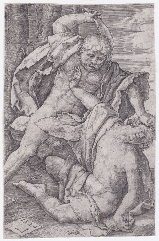 Dal libro della Genesi, 4: 3-8. Caino, sollevando l’osso di una mascella animale, si appresta a colpire Abele. Monogramma e data in basso a sinistra entro un foglio di carta gettato a terra. La L si presenta rovesciata. Stato unico, variante b/b riconoscibile per i toni meno neri e contrastati rispetto agli esemplari della variante a/b (British Museum) e la presenza di alcuni graffi, per esempio nella zona in alto a sinistra.