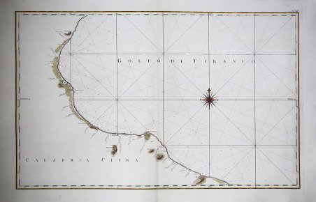 Carta nautica tratta del celebre ' Atlante Marittimo delle Due Sicilie ' opera realizzata dal cartografo padovano tra il 1783 ed il 1792. Incisa da Giuseppe Guerra. Rizzi Zannoni è considerato come il più importante cartografo italiano dai tempi di Giovanni Antonio Magini. Attivo in Francia, a Padova e soprattutto a Napoli (1781/1814), dove, nel periodo borbonico, poté fregiarsi anche del titolo di "geografo del Re". Con la venuta dei francesi, Rizzi Zannoni continuò ad attendere alla realizzazione delle carte del Regno. Nel 1807, fu posto a capo del Deposito topografico, istituito da Giuseppe Bonaparte; nel 1812, sotto il regno di Gioacchino Murat, riuscì a stampare l'ultimo dei 31 fogli dell'atlante geografico, la cui pubblicazione era iniziata nel 1788. ' Le opere realizzate a Napoli, in oltre trenta anni di attività, lo consacrarono come il maggiore cartografo italiano dell'età moderna ed uno dei più accreditati in Europa. Incisione in rame, lieve gora d'acqua, per il resto in ottimo stato di conservazione. Bibliografia V. Valerio, ' I Rami dell'Atlante Marittimo. Matrici, disegni, documenti del primo rilievo idrografico del Regno di Napoli. Nautical chart taken from the famous ' Atlante Marittimo delle Due Sicilie ' (Maritime Atlas of the Two Sicilies) by Rizzi Zannoni, printed between 1783 and 1792. Engraved by Giuseppe Guerra. ' Rizzi Zannoni is considered as the most important Italian cartographer since Giovanni Antonio Magini. Active in France, Padua and especially in Naples (1781/1814), where, in the Bourbon period, he could also boast the title of "geographer of the King". With the coming of the French, Rizzi Zannoni continued to attend to the realization of the charts of the Kingdom. In 1807, he was placed in charge of the Topographical Depot, established by Joseph Bonaparte; in 1812, under the reign of Joachim Murat, he managed to print the last of the 31 sheets of the geographical atlas, whose publication had begun in 1788. The works made in Naples, in over thirty years of activity, consecrated him as the greatest Italian cartographer of the modern age and one of the most accredited in Europe. Copper engraving, slight water marks, otherwise in excellent condition. Bibliografia V. Valerio, ' I Rami dell'Atlante Marittimo. Matrici, disegni, documenti del primo rilievo idrografico del Regno di Napoli. Cfr. Valerio, I Rami dell'Atlante Marittimo. Matrici, disegni, documenti del primo rilievo idrografico del Regno di Napoli.