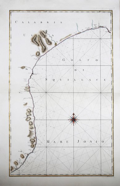Carta nautica tratta del celebre ' Atlante Marittimo delle Due Sicilie ' opera realizzata dal cartografo padovano tra il 1783 ed il 1792. Incisa da Giuseppe Guerra. Rizzi Zannoni è considerato come il più importante cartografo italiano dai tempi di Giovanni Antonio Magini. Attivo in Francia, a Padova e soprattutto a Napoli (1781/1814), dove, nel periodo borbonico, poté fregiarsi anche del titolo di "geografo del Re". Con la venuta dei francesi, Rizzi Zannoni continuò ad attendere alla realizzazione delle carte del Regno. Nel 1807, fu posto a capo del Deposito topografico, istituito da Giuseppe Bonaparte; nel 1812, sotto il regno di Gioacchino Murat, riuscì a stampare l'ultimo dei 31 fogli dell'atlante geografico, la cui pubblicazione era iniziata nel 1788. ' Le opere realizzate a Napoli, in oltre trenta anni di attività, lo consacrarono come il maggiore cartografo italiano dell'età moderna ed uno dei più accreditati in Europa. Incisione in rame, lieve gora d'acqua, per il resto in ottimo stato di conservazione. Bibliografia V. Valerio, ' I Rami dell'Atlante Marittimo. Matrici, disegni, documenti del primo rilievo idrografico del Regno di Napoli. Nautical chart taken from the famous ' Atlante Marittimo delle Due Sicilie ' (Maritime Atlas of the Two Sicilies) by Rizzi Zannoni, printed between 1783 and 1792. Engraved by Giuseppe Guerra. ' Rizzi Zannoni is considered as the most important Italian cartographer since Giovanni Antonio Magini. Active in France, Padua and especially in Naples (1781/1814), where, in the Bourbon period, he could also boast the title of "geographer of the King". With the coming of the French, Rizzi Zannoni continued to attend to the realization of the charts of the Kingdom. In 1807, he was placed in charge of the Topographical Depot, established by Joseph Bonaparte; in 1812, under the reign of Joachim Murat, he managed to print the last of the 31 sheets of the geographical atlas, whose publication had begun in 1788. The works made in Naples, in over thirty years of activity, consecrated him as the greatest Italian cartographer of the modern age and one of the most accredited in Europe. Copper engraving, slight water marks, otherwise in excellent condition. Bibliografia V. Valerio, ' I Rami dell'Atlante Marittimo. Matrici, disegni, documenti del primo rilievo idrografico del Regno di Napoli. Cfr. Valerio, I Rami dell'Atlante Marittimo. Matrici, disegni, documenti del primo rilievo idrografico del Regno di Napoli.