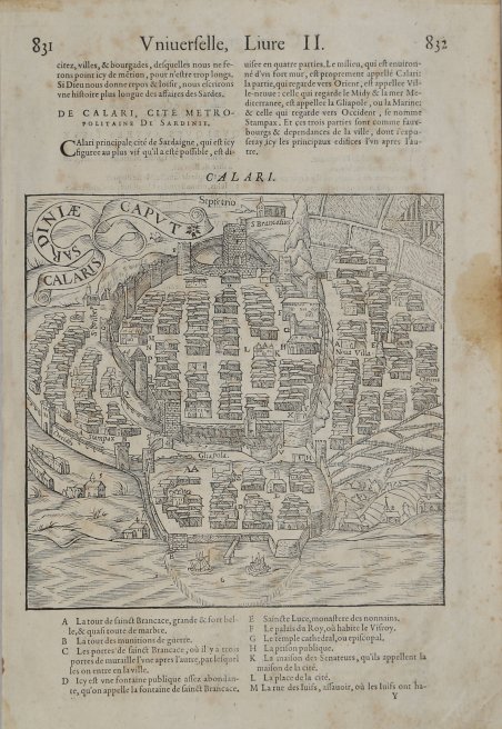 Veduta tratta dalla celebre ' La Cosmographie Universelle de tout le Monde ' (Parigi, 1575) di Francois de Belleforest, traduzione francese della ' Cosmographia ' di Sebastian Muenster. A differenza del Muenster, questa opera è pubblicata in una sola edizione, e risulta pertanto molto rara. Le tavole xilografiche incluse nell’opera sono derivazioni da Abraham Ortelius, Braun & Hogenberg oltre che da Muenster. Alcuni legni sono invece ripresi utilizzando le matrici pubblicate per la prima volta nel 1552 nella ' Cosmografia ' di Lione da Guèroult & Balthazar Arnoullet (1517-1556), nel ' Premier livre des figure set pourtraitz des villes plus illustre set renommées d’Europe, contenente 9 immagini urbane, perlopiù copiate dalla ' Cosmographia ' di Sebastian Muenster. L'opera fu pubblicata in due volumi. Solo 49 delle 163 incisioni che compaiono nei due volumi sono tratti dalla ' Cosmographia ' del Munster. Gli editori Chesneau e Sonnius fecero uso anche di materiale da poco apparso sul mercato librario. Xilografia, in ottimo stato di conservazione. Bibliografia M. Pastoureau, ' LES ATLAS FRANÇAIS XVIe-XVIIe siècles. Répertoire bibliographique et étude. - Belleforest I-1 [2]. Map taken from the famous ' La Cosmographie Universelle de tout le Monde ' (Paris, 1575) by Francois de Belleforest, a French translation of Sebastian Muenster's ' Cosmographia. Unlike the Muenster, this work is published in only one edition, and is therefore very rare. The woodcut plates included in the work are derivations from Abraham Ortelius, Braun & Hogenberg as well as Muenster. Some woodcuts, however, are taken using the plates first published in 1552 in the ' Cosmographia ' de Lyon by Guèroult & Balthazar Arnoullet (1517-1556), in the ' Premier livre des figures set pourtraitz des villes plus illustre set renommées d'Europe, containing 9 urban images, mostly copied from Sebastian Muenster's ' Cosmographia. ' The work was published in two volumes. Only 49 of the 163 woodcuts that appear in the two volumes are taken from Munster's ' Cosmographia. The publishers Chesneau and Sonnius also made use of material that had recently appeared on the book market. Woodcut, very good condition. Bibliografia M. Pastoureau, ' LES ATLAS FRANÇAIS XVIe-XVIIe siècles. Répertoire bibliographique et étude. - Belleforest I-1 [2]. Cfr. C. de Seta, L'immagine delle città italiane dal XV al XIX secolo, p. 133 n. 10