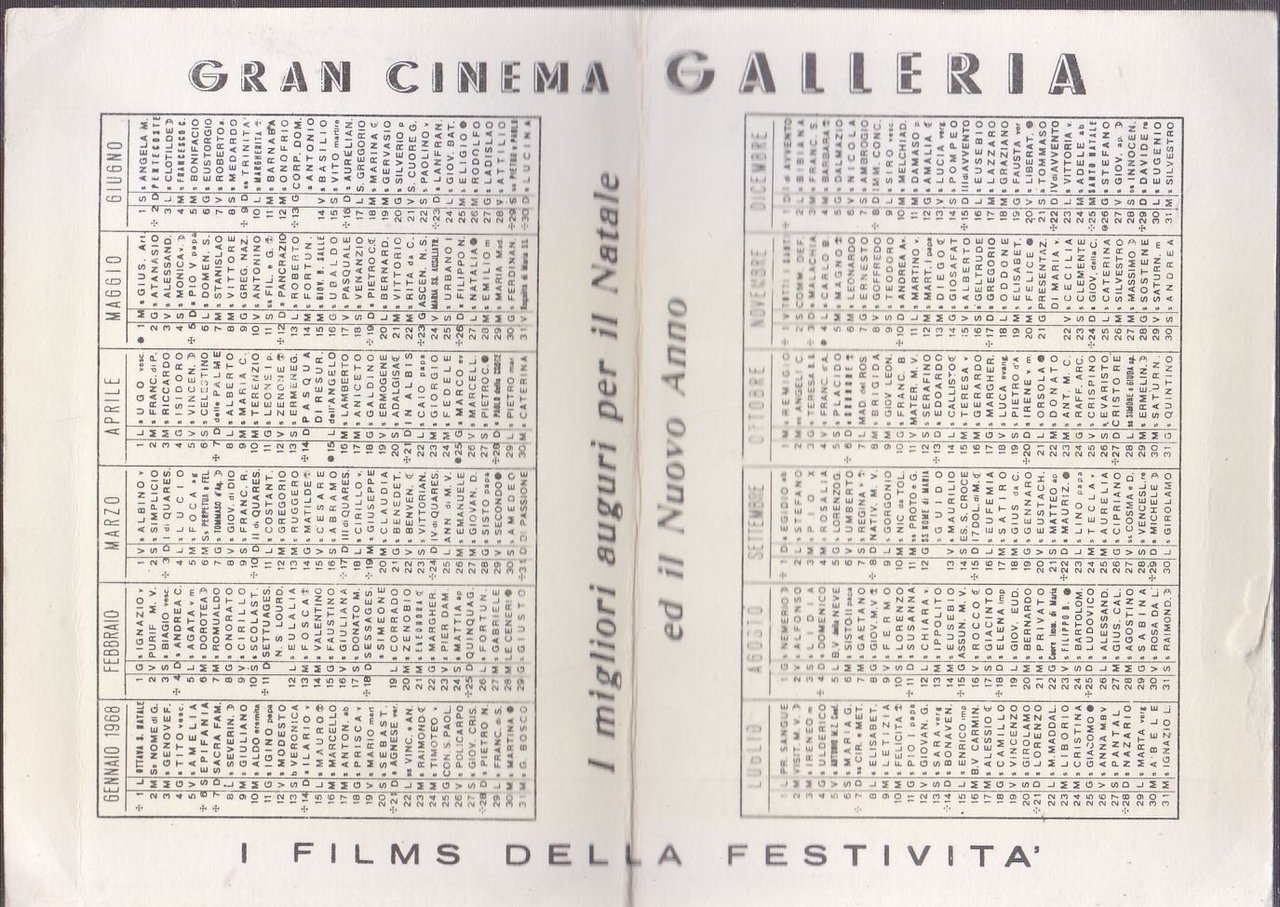 CALENDARIETTO GRAN CINEMA GALLERIA a Bari del 1968 in cartoncino