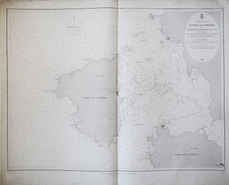 Carta nautica stampata dall’Istituto Idrografico della Marina. Aggiornata al 1882. La storia dell'Istituto Idrografico della Marina inizia pochi anni dopo l'unificazione nazionale con la creazione a Livorno, nel 1875, dell'Ufficio Centrale per il Servizio Scientifico della Regia Marina, dal quale avrebbero dovuto dipendere Uffici Dipartimentali eredi delle funzioni di elaborazione cartografica proprie delle istituzioni preunitarie. Fu invece creato il solo Ufficio Dipartimentale di Genova, presso il Forte San Giorgio, che a sua volta lasciò il posto, nel 1872, dall'ente cartografico nazionale denominato Ufficio Idrografico della Regia Marina. Nel 1899 tale denominazione fu trasformata in quella attuale di Istituto Idrografico della Marina. L'istituto fu fondato con regio decreto il 26 dicembre 1872 e alla sua guida fu chiamato il capitano di fregata, matematico e idrografo Giovan Battista Magnaghi, con il compito di eseguire il rilievo idrografico dei mari italiani e di produrre la documentazione nautica nazionale. Nel dopoguerra, oltre a ricognizioni per procedere all'aggiornamento delle carte nautiche, venne realizzata una nuova rete di triangolazione costiera. Incisione su zinco, con margini, in buono stato di conservazione. Bibliografia Amedeo Benedetti, L'Istituto Idrografico della Marina, in Charta Geographica, 93, ottobre 2007, pp. 12–13; Paola Presciuttini, L'Istituto Idrografico della Marina in Forte San Giorgio, Genova, I.I.M., 1995. The history of the Istituto Idrografico della Marina began a few years after the national unification with the creation in Livorno, in 1875, of the Ufficio Centrale per il Servizio Scientifico della Regia Marina, which should have depended on Departmental Offices heirs of the functions of cartographic processing of pre-unitary institutions. It was instead created only the Ufficio Dipartimentale di Genova, at Forte San Giorgio, which in turn left the place, in 1872, by the national mapping body called Ufficio Idrografico della Regia Marina. In 1899 this name was changed to the current name of Istituto Idrografico della Marina. ' The institute was founded by royal decree on 26 December 1872 and at its head was called the frigate captain, mathematician and hydrographer Giovan Battista Magnaghi, with the task of performing the hydrographic survey of the Italian seas and to produce the national nautical documentation. After the war, in addition to reconnaissance to update the nautical charts, a new coastal triangulation network was created. Engraving on zinc, with margins, in good condition. Bibliografia Amedeo Benedetti, L'Istituto Idrografico della Marina, in Charta Geographica, 93, ottobre 2007, pp. 12–13; Paola Presciuttini, L'Istituto Idrografico della Marina in Forte San Giorgio, Genova, I.I.M., 1995. Cfr.