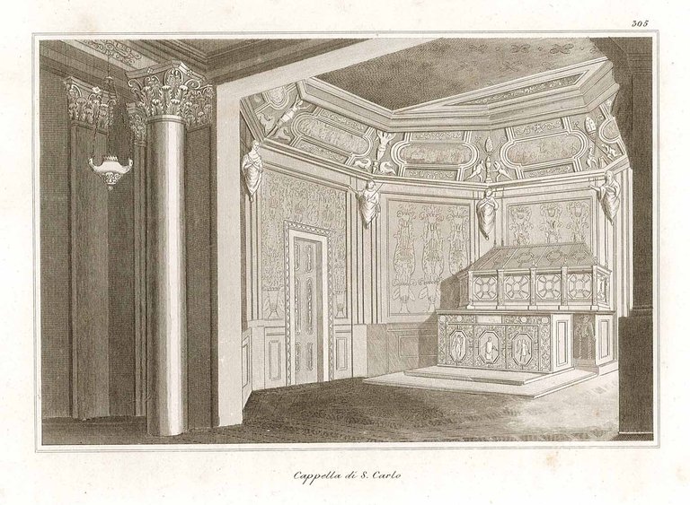Stampa antica ed originale con veduta della cappella di San CarloRif: Arrigoni, "Milano nelle vecchie stampe", vol I, p. 64, n°182