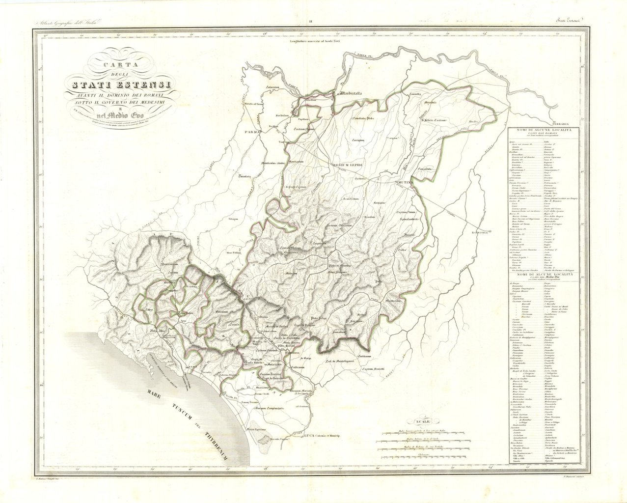 Carta geografica, antica ed originale, con rappresentazione antica degli Stati Estensi. Al lato sinistro, entro riquadro, elenco dei nomi delle località usati dai Romani e nel Medio Evo. Inserita nel I volume dell'opera "Atlante Geografico degli Stati Italiani delineato sopra le migliori e più moderne mappe per servire di corredo alla Corografia Fisica Storica e Statistica dell'Italia" contenente le carte dell'Italia Superiore. Descritta da Attilio Zuccagni-Orlandini, edita e stampata a Firenze nel 1844-45. Autore: Zuccagni - Orlandini edit. & G.Maina e V.Stanghi inc. Luogo: Modena. Anno: 1844. Tecnica: incisione in rame. Dimensioni: 537x668 mm. L'incisione è caratterizzata da una coloritura coeva ai confini
