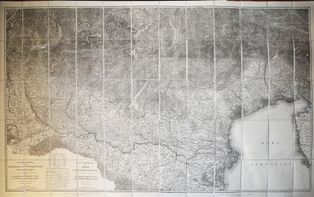 Carta murale dell’Italia settentrionale in quattro fogli applicati su tela a stacchi. L’orografia è rappresentata col tratteggio a luce zenitale. Gli abitanti sono distinti in cinque classi; sono indicate le stazioni di posta, le miniere etc. Sono riportati due titoli, in italiano e in tedesco, la leggenda dei segni convenzionali e un prospetto delle divisioni amministrative. Si presenta conservata nel suo astuccio originale.Edita a Milano nel 1838 e riveduta nel 1856. Wall paper from northern Italy in four sheets applied on burlap.The orography is represented by the zenith light line.The habitants are divided into five classes; mail stations, mines etc. are indicatedThere are two titles, in Italian and in German, the legend of conventional signs and a list of administrative divisions.Map is presented in its original case.Edited in Milan in 1838 and revised in 1856. Cfr. Marinelli, n. 1669; Arrigoni-Bertarelli, n. 1075; IGM, n. 89