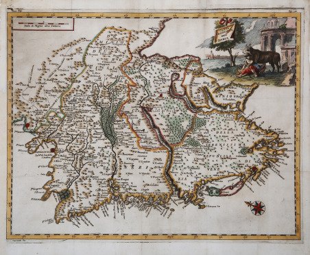 Carta geografica ' tratta dall’edizione napoletana dell’opera di Thomas Salmon ' Lo stato presente di tutti i paesi e popoli del mondo naturale, politico e morale con nuove osservazioni degli antichi e modemi viaggiatori. Scritto in inglese dal signor Salmon. Tradotto in olandese e franzese ed ora in italiano, in questa seconda edizione più corretto, ' in Napoli, ' presso Francesco Ricciardo (poi Vincenzo Mazzola ed Angelo Vocola) 1738-1767. L’opera, il cui titolo originale era ' Modern history, or the present state of all nations, ' fu tradotta dall’inglese e stampata per la prima volta in Venezia dall’Albrizzi (1737-1766). L’editore Francesco Ricciardi ne realizzò una copia pirata, a Napoli, a partire dal 1738. La raccolta, in 25 tomi, fu stampata dal 1738 ' al 1753 da Ricciardi; a partire ' dal 18° volume, da Vincenzo Mazzola ed Angelo Vocola. Le tavole furono incise da Francesco Sesone e Francesco Cepparuli. Le carte dell'Albrizzi furono incise per il suo ' Atlante Novissimo ' del 1740-50. In particolare, il Sesone fu uno dei più laboriosi incisori della Napoli del XVIII secolo, producendo un gran numero di tavole per libri di archeologia. Del Sesone Giovanni Gori Gandellini dice: “Romano, attese alla professione dell'intaglio sotto la direzione del Frezza, ed infatti riuscì gran disegnatore, ed intagliatore a bulino, e ad acqua forte. Non lasciò di riportare nelle stampe molte opere di valenti uomini con una dolcezza ammirabile e con gran vaghezza. Viveva a Napoli nel 1733 con somma fama in età di 28 anni [.] Non era uno sprovveduto, e lo dimostrano i lavori eseguiti ancora prima del '40: con Ricciardi aveva inciso, su disegno di Ferdinando Sanfelice, una tavola per un testo celebrativo, ed altre per un lavoro di Thomas Salmon molto in voga in quegli anni”. Incisione in rame, in buono stato di conservazione. Map taken from the Neapolitan edition of the work of Thomas Salmon, ' Lo stato presente di tutti i paesi e popoli del mondo naturale, politico e morale con nuove osservazioni degli antichi e modemi viaggiatori. Scritto in inglese dal signor Salmon. Tradotto in olandese e franzese ed ora in italiano, in questa seconda edizione più corretto ' in Naples, by Francesco Ricciardo (later Vincenzo Mazzola and Angelo Vocola) 1738-1767. The work, whose original title was ' Modern history, or the present state of all nations, ' was translated from English and printed for the first time in Venice by Albrizzi (1737-1766). The publisher Francesco Ricciardi realized a pirated copy, in Naples, starting from 1738. The collection, in 25 tomes, was printed from 1738 to 1753 by Ricciardi; starting from the 18th volume, by Vincenzo Mazzola and Angelo Vocola. The plates were engraved by Francesco Sesone and Francesco Cepparuli. In particular, Sesone was one of the most industrious engravers in 18th century Naples, producing a large number of plates for books on archaeology. Giovanni Gori Gandellini says of Sesone: Roman, attended the profession of carving under the direction of Frezza, and in fact succeeded as a great designer, and engraver burin, and strong water. He did not leave to bring back in print many works of talented men with an admirable sweetness and with great vagueness. He lived in Naples in 1733 with great fame at the age of 28 years [.] He was not a novice, and this is demonstrated by the work done even before '40: with Ricciardi had engraved, designed by Ferdinando Sanfelice, a plate for a celebratory text, and others for a work of Thomas Salmon very popular in those years. Copper engraving, in good condition. Cfr.