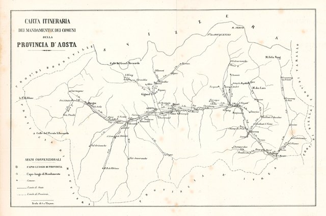 Carta geografica, antica ed originale, della provincia di Aosta. Allegato: una tavola poliometrica dei mandamenti e diverse tavole di itinerari con specifica delle distanze, delle tappe, ecc.