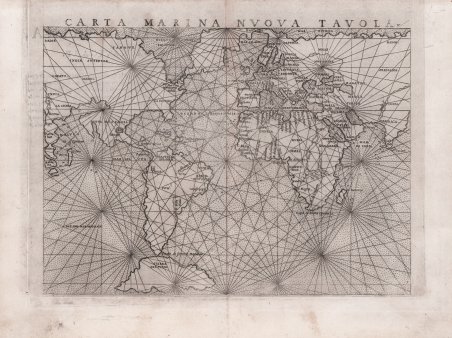 La mappa di Ruscelli è molto interessante per la sua rappresentazione dei cinque continenti conosciuti, legati tra loro come una superficie continua. Questa mappa presenta una vista della superficie terrestre già piuttosto obsoleta ai tempi della sua pubblicazione. Già in precedenza, altri cartografi, partendo da Matrin Waldseemuller nel 1507, avevano messo in dubbio l’affermazione di Colombo secondo cui Asia e America fossero un unico continente. I viaggi di Magellano e altri esploratori, che permisero di conoscere definitivamente la reale estensione dell’oceano Pacifico, diedero ulteriore sostegno a tali dubbi, sebbene lasciassero aperta la possibilità di una connessione amer-asiatica a settentrione. Intorno alla metà del XVI secolo, tuttavia, anche questa ultima ipotesi venne completamente screditata, per essere rimpiazzata dall’idea di un ipotetico “stretto di Anian”. Altra interessante caratteristica di questa mappa è l’intreccio di “linee dei sestanti” radianti da 16 punti focali intorno alla mappa. Le linee dei sestanti erano strumenti di navigazione che aiutavano a mantenere la medesima posizione della bussola per raggiungere un qualsiasi punto di una linea da un altro punto della medesima. Queste sono semplicemente ornamentali e illustrative, in quanto la mappa è troppo piccola per essere funzionale. Carta tratta dalla ' Geographia di Claudio Tolomeo, a cura di Girolamo Ruscelli, pubblicata in Venezia in più edizioni tra il 1561 ed il 1598. La carta è basata sulla “Geografia” di Giacomo Gastaldi (1548), che probabilmente disegnò personalmente anche queste mappe, che vennero incise dai fratelli Livio e Giulio Sanuto. La peculiarità di queste mappe è che sono incise due per lastra e successivamente tagliate; questo il motivo per cui il segno del rame appare solo in tre lati della mappa. Il testo del Ruscelli e le sue carte sono considerate come il miglior atlante moderno fino alla prima versione del ' Theatrum ' ' Orbis Terrarum ' di Abraham Ortelius (1570). Solo la loro larga diffusione ne impedisce una valutazione sostenuta nel mercato antiquario. L'opera infatti ebbe una prima stesura nel 1561, stampata da Vincenzo Valgrisi che ne curò anche la ristampa del 1562. Tre sono le edizioni firmate da Giordano Ziletti (due nel 1564 e una del 1574), mentre nel 1597 viene edita dai fratelli Calignani. Tutte queste edizioni contengono 64 tavole. Nel 1598 e 1599 vengono alla luce le due edizioni curate da Giuseppe Rosaccio e stampate dagli Eredi di Melchior Sessa. Queste ultime due edizioni comprendono 69 tavole; sono infatti aggiunte la carta del planisfero e dei continenti di Rosaccio. Acquaforte e bulino, in ottimo stato di conservazione. Nice example of Ruscelli’s Carta Marina, based upon Gastaldi’s map of 1548. Gastaldi's Carta Marina includes the earliest obtainable depictions of the California peninsula, is the earliest obtainable copperplate world map for collectors. Includes Gastaldi's belief in a continuous northern landmass, the isthmus reported by Verrazano in 1524, which closes the northern continents into as unbroken ring. The Asia-America connection was a standard concept, and one of which Gastaldi actively advocated. The joining of North America and Europe is unusual, resulting from two errors. In the east, Gastaldi depicts Greenland as an outgrowth of Scandinavia, based upon Waldseemuller. In the west, Gastaldi follows Verrazano’s model of North America. On the Atlantic coast by Gastaldi notes a green mountain and a large, unnamed cape pointing upwards. This cape, based upon Ramusio’s' map of 1534, first appeared in Ribero’s manuscript chart of 1529, as well as later works, such as Jode’s North America. The cape is believed to be Cape Cod, as both the Ribero and Ramusio maps reflect the reconnaissance along the New England coast by Estavao Gomes, who is believed to have coasted the region. The writing’s of Marco Polo are evident in Asia, with modern corrections. Map taken from ' Geographia di Claudio Tolomeo ' edited by Girolamo Ruscelli, published in Venice in several editions between 1561 and 1598. The maps is based on the ' Geografia ' by Giacomo Gastaldi (1548), who probably also personally drew these maps, which were engraved by the brothers Livio and Giulio Sanuto. The peculiarity of these maps is that they are engraved two for plate and subsequently cut; this is why the copper sign only appears on three sides of the map. Ruscelli's text and his maps are considered to be the best modern atlas up to the first version of Abraham Ortelius' ' Theatrum Orbis Terrarum ' (1570). Only their widespread diffusion prevents a sustained evaluation in the antiquarian market. In fact, the work had a first edition in 1561, printed by Vincenzo Valgrisi who also edited the 1562 reprint. There are three editions signed by Giordano Ziletti (two in 1564 and one in 1574), while in 1597 it was published by the Calignani brothers. All these editions contain 64 plates. In 1598 and 1599 the two editions edited by Giuseppe Rosaccio and printed by the heirs of Melchior Sessa came to light. These last two editions include 69 plates; in fact, Rosaccio's map of the planisphere and continents has been added. Etching and engraving, in good condition. Cfr. R. W. Shirley, "The Mapping of the world", 111
