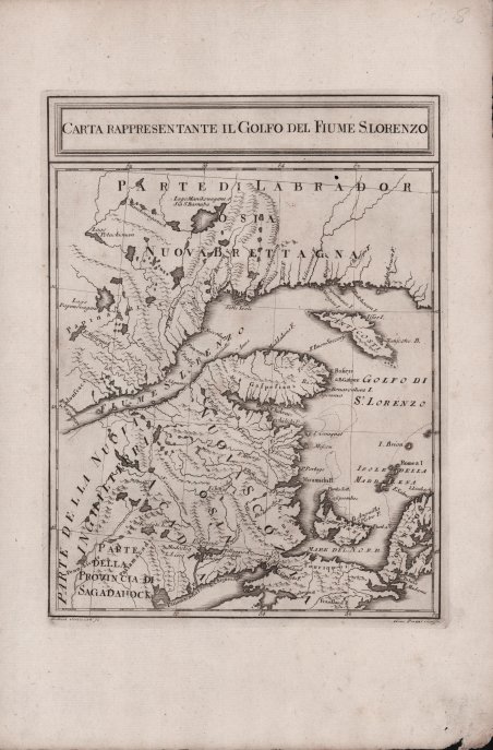 Carta geografica tratta dal raro "Il Gazzettiere Americano" edito dalla tipografia di Marco Coltellini nel 1763"Il Gazzettiere americano, contenente un distinto ragguaglio di tutte le parti del Nuovo Mondo", in 3 volumi, con testi curati da Giuseppe Pazzi, rappresenta la prima traduzione italiana, arricchita di note e carte, del "The American Gazetteer" pubblicato l'anno prima a Londra da Millar&Tonson. La traduzione italiana ottenne un ottimo successo di vendita.I disegni e le carte che corredano l'atlante, sono derivate dai modelli del cartografo francese Jacques Nicolas Bellin, usate per sia per il "Petit Atlas Maritime" che per "Histoire Generales de Voyages", rispetto alle quali son tuttavia arricchite da cartigli decorativi e finemente incise. Le opere portano le firme di Veremondo Rossi, Andrea Scacciati, Giuseppe Maria Terreni e anche Violante Vanni, un raro caso italiano di impegno femminile in campo cartografico. Incisione su rame, in ottimo stato di conservazione. Map from "Il Gazzettiere Americano", including maps after Nicolas Bellin. The atlas, in 3 volumes, with texts written by Giuseppe Pazzi, is the first Italian translation, enriched with notes and maps of "The American Gazetteer" published the year before in London by Millar & Tonson. The maps accompanying the atlas are derived from the French cartographer Jacques Nicolas Bellin, used for both the "Petit Atlas Maritime" and for "Histoire Generales de Voyages", with respect to which, however, are embellished with decorative cartouches and finely engraved. The works bear the signatures of Veremondo Rossi, Andrea Scacciati, Giuseppe Maria Terreni and also Violante Vanni, a rare case of Italian women's engagement in the cartographic field.Copperplate, showing the usual folds, wide margins, two small warm holes, generally in very good condition. Rare. Cfr.