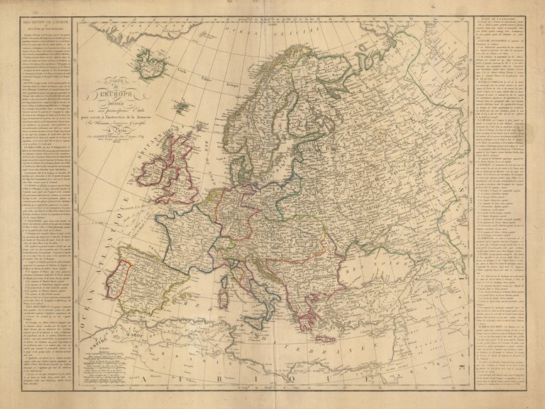 Carta geografica, entro margine graduato, raffigurante il territorio dell'Europa. Lateralmente elenco degli stati europei con relativa descrizione. Incisione caratterizzata da coloritura confinale all'acquerello coeva. Piega centrale. Autore: Herisson dis. & Basset edit. Luogo: Europa. Anno: 1833. Tecnica: incisione in rame. Dimensioni: 510x690 mm. Complessivamente esemplare molto buono