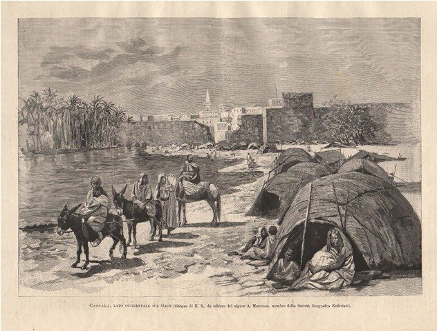 Veduta di Cassala e di un accampamento animato da personaggi. Testo al retro