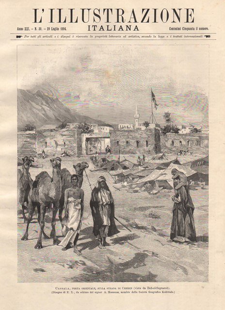 Veduta della città di Cassala situata nei pressi della frontiera con l'Eritrea, conquistata dalle truppe italiane guidate dal generale Oreste Baratieri (Condino 1841 - Vipiteno 1901) il 17 luglio 1894 durante la battaglia di Cassala. Testo al retro