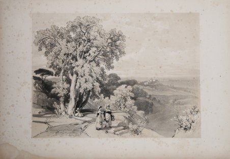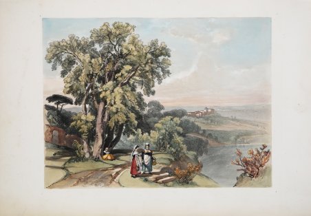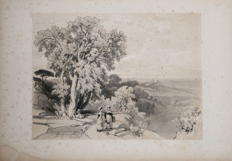 Veduta tratta da “Sketches at home and abroad”, di HARDING, James Duffield (1798-1863), pubblicato a Londra da Charles Tilt, [1836].“This book represents something of a landmark in the history of the lithograph in that it may be said to initiate the series of tinted lithographs, which . were to dominate the market for many years, reaching a peak of ambitious bulk in Roberts’s Holy Land, 1842–9” (Abbey). L’opera venne pubblicata stampata su carta litografica in “folio imperiale” e conteneva cinquantuno litografie a tinta unica (incluso il frontespizio), tutte disegnate da James Harding. Le viste includevano scene di Gran Bretagna, Francia, Monaco, Italia e Germania.I disegni originali furono realizzati in un periodo compreso tra il settembre 1824 e l'ottobre 1835, ma molti risalgono al 1834, quando J. D. Harding fece un lungo tour continentale. Non si sa quando i disegni furono tradotti a stampa, ma presumibilmente qualche tempo dopo l'ottobre 1835. Furono stampati da Hullmandel e pubblicati da Charles Tilt in un'edizione limitate di 1.000 esemplari.Le litografie di questo lavoro conferirono a James Duffield Harding una solida reputazione, sia in Inghilterra che nel continente. In effetti, per il suo lavoro “Sketches at Home and Abroad“ l'artista venne insignito con un anello di diamanti del re Louis-Phillipe di Francia.Litografia tinta, finemente colorata a mano, in ottimo stato di conservazione.Bibliografia Abbey Travel 29; Cremonini 126; RIBA 1465. View of the town, taken from the "Sketches at home and abroad. London: Charles Tilt, [1836] by Harding.“This book represents something of a landmark in the history of the lithograph in that it may be said to initiate the series of tinted lithographs, which . were to dominate the market for many years, reaching a peak of ambitious bulk in Roberts’s Holy Land, 1842–9” (Abbey). Sketches at Home and Abroad was published as a set of imperial folio size and contained in total fifty-one original plates of single tint lithographs (including the title page), all drawn on the stone by James Harding. The views included scenes of Britain, France, Monaco, Italy and Germany. The original drawings were made over a period from September 1824 to October 1835, but many date from 1834 when J. D. Harding made an extensive continental tour. It is not known when the drawings were put on stone, but presumably some time after October, 1835. They were printed by Hullmandel and published by Charles Tilt in an edition of 1,000 copies, after which the drawings were then effaced from the stones. The lithographs from this meticulously made set gained for James Duffield Harding a strong reputation, both in England and on the continent. In fact, for his work dealing with Sketches at Home and Abroad the artist was presented with a diamond ring from King Louis-Phillipe of France. Tinted litograph with fine later hand colour, good condition. Bibliografia Abbey Travel 29; Cremonini 126; RIBA 1465. Cfr.