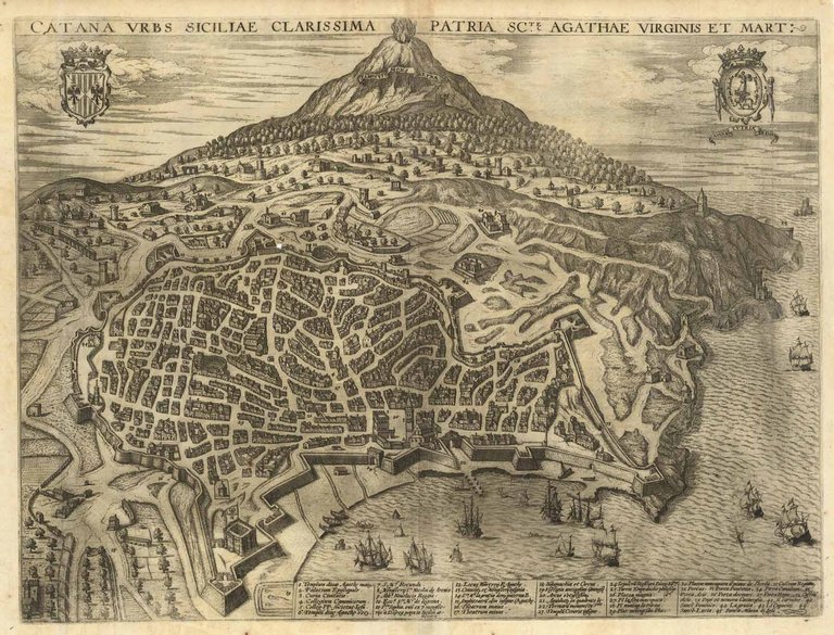Veduta planimetrico prospettica della città di Catania. Il titolo corre lungo il lato superiore per tutta la larghezza dell'incisione. Nell'angolo in alto a sinistra è raffigurato lo stemma della Sicilia, mentre nell'angolo in alto a destra compare quello della città, al centro del quale è rappresentato un elefante sormontato dalla figura di S. Agata. Lungo il margine inferiore troviamo 45 rimandi ai luoghi notabili della città suddivisi in cinque colonne. L'incisione è simile alla tavola pubblicata nel quinto volume del Civitates Orbis Terrarum di Braun & Hogenberg che a sua volta ripropone il modello compositivo introdotto nel 1592 dallo Stizzia, stampato a Roma da Nicolas van Aelst. L'incisione presenta dimensioni leggermente ridotte rispetto a quelle della tavola di Braun & Hogenberg dalla quale differisce totalmente per quanto riguarda gli elementi decorativi come i vascelli che risultano più numerosi e disposti in maniera differente. L'opera deve essere stata data alle stampe da una tipografia minore, e pubblicata in forma anonima per non incorrere nell'accusa di plagio. "La carta è a noi nota solo attraverso l'esemplare appartenuto alla collezione di Giannalisa Feltrinelli, dispersa in asta a Londra nel 1998, e oggi conservato nella collezione Spagnolo-Patermo di Catania." (Bifolco, Ronca: III, 2134). Esemplare che gode di un ottimo stato di conservazione generale. Rarissima.Rif: Bifolco, Ronca 2018: III, 2134