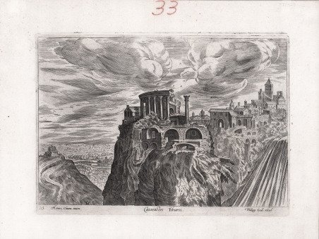 Veduta tratta dalla raccolta ' Ruinarum varii prospectus, ruriumque aliquot delineationes ' pubblicata da Philip Galle con incisioni tratte da disegni di Hendrick van Cleve o Cliven III. Figlio e allievo di William van Cleve, si trasferisce in Italia nella metà del XVI secolo. Oltre ad un dipinto raffigurante una veduta di Roma, datato 1550, realizza un cospicuo numero di disegni che serviranno come modelli per l’opera incisa, realizzata al ritorno ad Anversa e pubblicata nel 1587. Le vedute, che raffigurano principalmente Roma ma anche altre città europee, recano in basso le iscrizioni “Henri. Cliven. inven.” o “Henri Cliven pingebat”, che ne attestano la derivazione, ma non l'autografia. È certo che Hendrick viaggiò in Italia. Gli studiosi non sono d'accordo sui tempi del suo soggiorno: alcuni lo collocano prima del 1551, anno in cui divenne maestro della Gilda, altri tra il 1551 e il 1555, data in cui si sposò. In Italia fece molti disegni di vedute di montagne, edifici e paesaggi urbani, che poi utilizzò nelle sue opere. Sulla base dei suoi disegni noti di città italiane, probabilmente trascorse del tempo a Roma, Firenze e Napoli. Hendrick van Cleve era un artista di paesaggio, creava sia vedute topografiche sia paesaggi immaginari. Questi sono in stile italianizzante, raffigurano ampie vedute con rovine che possono essere o meno interamente immaginarie. Le rovine sono di solito una compilazione di elementi caratteristici dell'architettura classica; alcune sono basate su rovine esistenti che possono essere identificate, altre sono costruzioni completamente di fantasia dell’artista. I disegni di Hendrik van Cleve furono, quindi, usati dai tipografi contemporanei di Anversa. Due serie di stampe, secondo i disegni di van Cleve, furono pubblicate dal famoso incisore ed editore Philips Galle. La prima serie, ' Regionem, rurium, fundormumq[ue], varii atove amoeni prospectus, pubblicata nel 1587, comprende 10 tavole che raffigurano principalmente paesaggi pastorali immaginari con rovine. Hendrik van Cleve è menzionato come disegnatore su ogni stampa e Philip Galle come incisore. La seconda serie intitolata ' Ruinarum varii prospectus, ruriumq[ue] aliquot delineationes ' non è datata, ma fu, probabilmente, pubblicata nello stesso periodo della prima. Le 38 stampe mostrano vedute mediterranee, non è chiaro chi abbia inciso questa serie. ' La firma con il monogramma di H. van Cleve appare su tutte le 38 incisioni, ad eccezione della n° 22. La firma di Philip Galle appare su tutte le incisioni mentre quella di suo figlio Theodoor si vede solo su una. Anche Hendrick van Cleve stesso potrebbe essere stato l'incisore della serie. ' Incisione al bulino, bella impressione su carta vergata coeva, in ottimo stato di conservazione. A nice view taken from the rare ' Ruinarum vari prospectus ruriumq. Aliquot delinationes. Hendrick van Cleve or Cliven III, son and pupil of William van Cleve, moved to Italy in the second half of the XVI century; besides a painting depicting a view of Rome (1550), he realized a considerable amount of drawing which he afterwards used as preparatory for the engravings he realized in Antwerp and published by Philip Galle in 1587. The views, whose main subject is Rome but there are also other European cities, bear the inscription “Henri. Cliven. Inven” or “Henri Cliven pingebat” on lower part, which testify their origin, but not necessarily the fact that he realized them. It is certain that Hendrick travelled to Italy. Scholars disagree about the timing of his stay in Italy. Some place it before 1551, the year in which he became a master of the Guild, while others place it between 1551 and 1555, the date on which he got married. In Italy he made many drawings of mountain views, buildings and cityscapes, which he later used in his works. Based on his known drawings of Italian cities, he likely spent time in Rome, Florence and Naples. Hendrick van Cleve was a landscape artist. He created topographical views as well as imaginary landscapes. His landscapes are in the Italianising style and typically depict wide views with ruins that may or may not be entirely imaginary. The ruins are usually a compilation of characteristic elements from classical architecture. Some are based on existing ruins which can be identified. Others are completely fabricated constructions Hendrik van Cleve’s drawings were used by contemporary printmakers in Antwerp as designs. Two series of prints after van Cleve's designs were published by the renowned engraver and publisher, Philips Galle. The first series, ' Regionem, rurium, fundormumq[ue], varii atove amoeni prospectus ' was published in 1587. It consists of 10 plates that mainly depict imaginary pastoral landscapes with ruins. Hendrik van Cleve is mentioned as the designer on each print and Philip Galle as the engraver. The second series entitled ' Ruinarum varii prospectus, ruriumq[ue] aliquot delineationes ' is undated but was likely published around the same time as the first one. The 38 prints show Mediterranean views. It is not clear who engraved this series. ' H. van Cleve’s signature and monogram appear on all 38 engravings with the exception of engraving n.22 of the set which lacks the monogram. Philip Galle’s signature also appears on all the engravings while that of his son Theodoor appears on engraving only. Hendrick van Cleve III may also have been the engraver as his monogram is present on the print. ' Engraving, good impression on contemporary laid paper, in very good conditions. Cfr. Hollstein 23