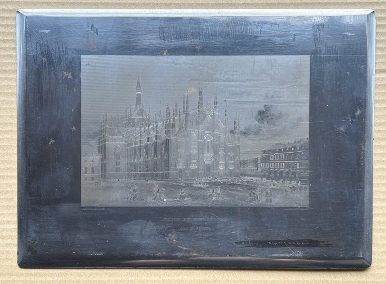 Matrice originale incisa all’acquaforte databile alla metà del XIX secolo. Affascinante poter vedere il lavoro inciso direttamente sulla lastra e poterne valutare i differenti tratteggi. La lastra si presenta in ottime condizioni ed ancora utilizzabile per ulteriori stampe calcografiche. Usata per la tiratura della stampa inserita nell'edizione "Voyage Pittoresque en Italie, partie septentionale" par M. Paul. de Musset, Paris 1855. Autore: Rouargue frères del et sculp. Luogo: Milano. Anno: 1855. Tecnica: acquaforte su lastra di metallo acciaiata. Dimensioni: 120x180 (lastra 210x280).