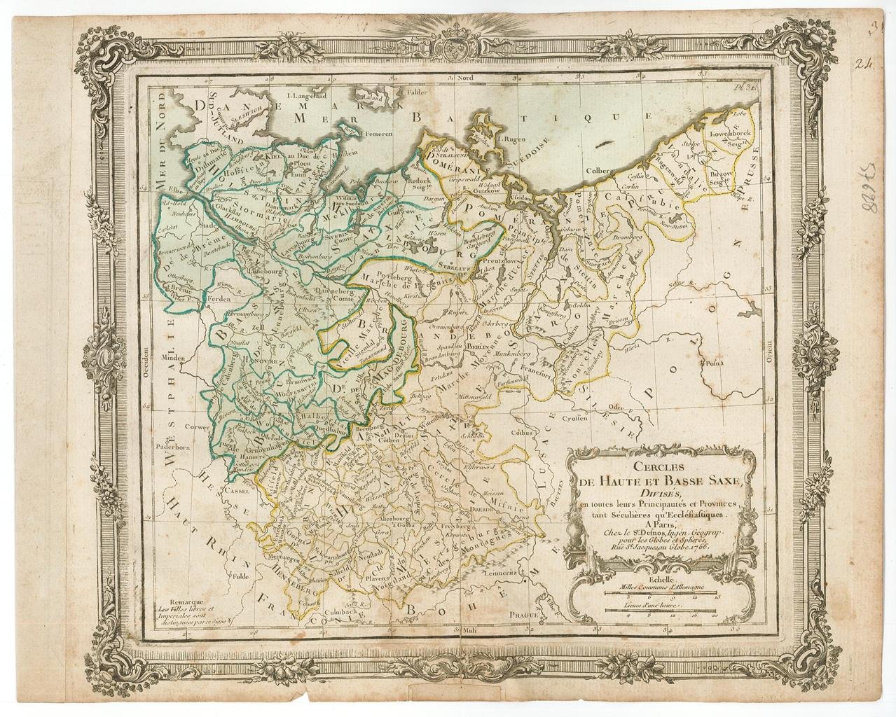 Carta geografica, antica ed originale, in coloritura coeva facente parte dell'opera "Atlas General, Civil, Ecclesiastique et Militaire, Methodique et Elementaire pour l'Etude de la Geographie et de l'Historique." creata da Louis Brion de La Tour e diretta da Louis Charles Desnos, pubblicata a Parigi nel 1786, La carta presenta un ridimensionamento alla cornice nella parte superiore. Autore: Brion de La Tour Louis, 1743 – 1803. Luogo: Paesi Bassi. Anno: 1786. Tecnica: incisione in rame. Dimensioni: 280x350 mm il foglio