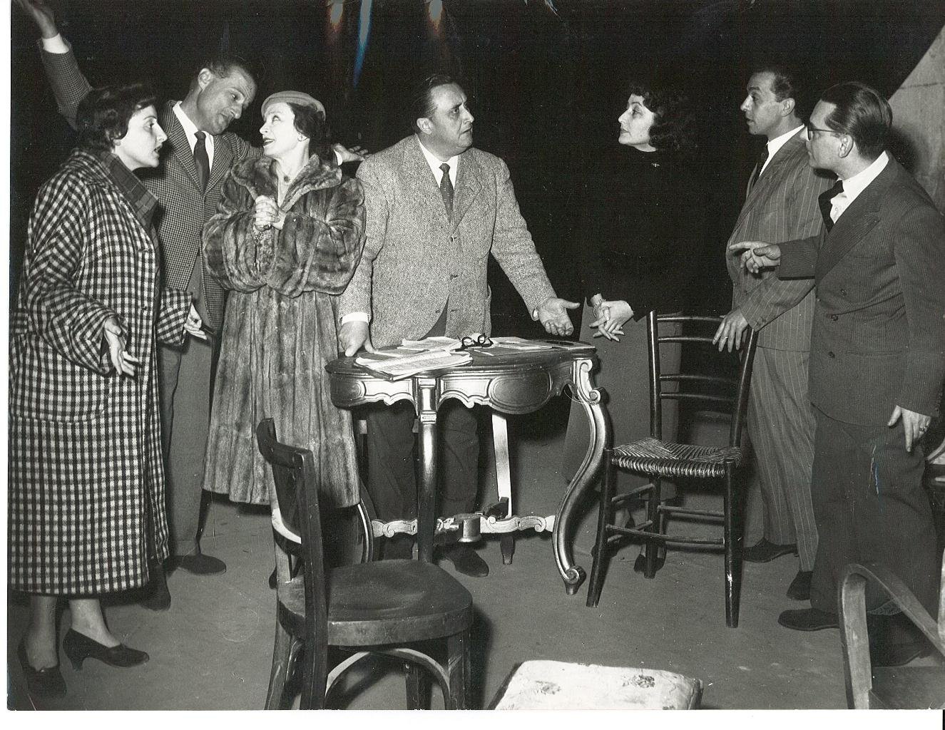 Fotografia originale delle prove de “Il Galantuomo per transizione” sul palcoscenico del Teatro Goldoni di Roma, commedia di Giraud. Tra gli attori anche Giuliana Corbellini, Corrado Annicelli, Marisa Mantovani, Pietro Privitera e il regista Giovanni Calendoli. Al retro Bosio Pressphoto - Roma