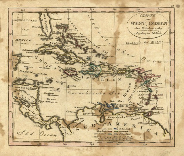 Cuba, Haiti, Santo Domingo, Antille. Coloritura coeva. Macchie