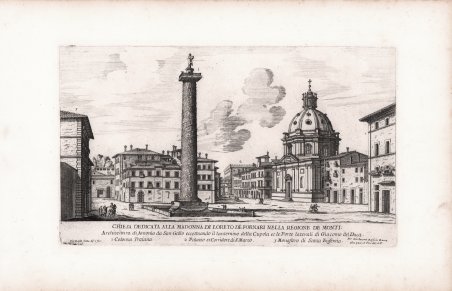 Nel 1500 papa Alessandro VI Borgia donò alla Confraternita dei Fornari una piccola cappella, di fronte alla colonna Traiana, che venne poi abbuattuta per erigere una nuova chiesa dedicata alla Madonna di Loreto. Esemplare di primo stato, avanti la numerazione, tratto da ' Il nuovo teatro delle fabriche, et edificii, in prospettiva di Roma moderna, sotto il felice pontificato di N. S. papa Alessandro VII.Opera in tre volumi, edita da Giovanni Giacomo de Rossi tra il 1665 e il 1669, illustra le fabbriche realizzate o ampliate durante il pontificato di Alessandro VII Chigi, mentre il III si riferisce alle chiese restaurate dal pontefice Clemente IX. L'opera aveva lo scopo di divulgare la nuova immagine di Roma, con i suoi palazzi, chiese e giardini, secondo un progetto unitario di espansione urbana, in sintonia con i criteri del colto e raffinato Fabio Chigi: il papa, infatti, decise di aprire nuove strade, di abbellire con fontane e monumenti la città, anche a dimostrazione della potenza finanziaria e culturale della sua famiglia. Prima di allora l'incisione di veduta a Roma, che pure aveva prodotto numerose serie dì stampe da Etienne Dupérac a Giacomo Lauro, si era interessata principalmente alla ripresa della città antica. Bisognerà attendere proprio il completamento dei rinnovamenti urbanistici e delle realizzazioni architettoniche dei papi seicenteschi, per assistere alla diffusione di raccolte dedicate alla città moderna. Giovan Battista Falda ha contribuito, con la vasta serie di incisioni di vedute, a divulgare un'immagine della città di Roma legata alla magnificenza e munificenza dei Papi seicenteschi: città ricca di chiese, palazzi, giardini che si affiancavano ai resti del glorioso passato. ' L'incisore dedicò tutta la sua pur breve vita a creare, attraverso precise ed attente vedute prospettiche, piante e stampe su avvenimenti cittadini, canonizzazioni, ingressi di pontefici e reali stranieri, un grosso affresco unitario che celebrasse nel suo insieme la nuova grandezza raggiunta dalla Roma moderna, grazie soprattutto alla geniale e lungimirante opera di papa Alessandro VII Chigi (1655 - 1667). Dopo la morte del Falda, verrà pubblicato, sempre dalla tipografia De Rossi, ' Il quarto libro del nuovo teatro delli palazzi in prospettiva di Roma moderna dato in luce sotto il felice pontificato di nostro signore papa Innocenzo XII, di Alessandro Specchi, edito nel 1699 e naturale prosecuzione della raccolta. Acquaforte, impressa su carta vergata coeva, con margini, in ottimo stato di conservazione. Example in the first state, before the number, taken from ' Il nuovo teatro delle fabriche, et edificii, in prospettiva di Roma moderna, sotto il felice pontificato di N. S. papa Alessandro VII. One of the most important architectural projects of the seventeenth century was the urban renovation of Rome. Under the brilliant leadership of Pope Alessandro VII (1655-1667), Rome dramatically emerged as one of the most modern and beautiful cities of the new Baroque age. Within several decades spacious roadways were constructed, monumental buildings arose, and many public squares appeared with elaborate fountains and monuments. To be sure, this massive undertaking was meant to underline the absolute power of the Papacy but it also brought forth a new flowering of Italian art and architecture. ' The ' Nuovo Teatro ' was initiated in 1665 to depict the new Rome in a series of etchings. What it gave to future generations was a magnificent historical record of views etched by two of Italy's greatest architectural artists. ' The printing and publishing of these important etchings was entrusted to Giacomo de Rossi (1626-1691), the head of the most dominant Roman publishing house. ( Sons and nephews of de Rossi, in fact, continued the publishing house until 1738 when the business was sold to Pope Clement XII to form the basis of the ' Regia Calcografia.) ' Altogether, four sets of ' Nuovo Teatro ' were created during the seventeenth century. Volumes one and two were both published in the year of 1665 and dealt mainly in views of the new piazzas, gardens, terraces and their surrounding buildings. Volume 3 was published in 1669 and concentrated upon the newly constructed churches of Rome. Every plate from the first three sets was both designed and etched by the influential architectural artist, Giovanni Battista Falda (1643-1678). For reasons unknown the fourth and final volume ' Il quarto libro del nuovo teatro delli palazzi in prospettiva di Roma moderna dato in luce sotto il felice pontificato di nostro signore papa Innocenzo XII, (52 etchings) did not appear until 1699. ' It was published by Giacomo's successor, Domenico de Rossi, and featured views of the palaces and stately homes of Rome. Each plate was designed and etched by the famous architect and etcher, Alessandro Specchi (1668-1729). ' Etching, printed on contemporary laid paper, with margins, in good condition. Cfr.