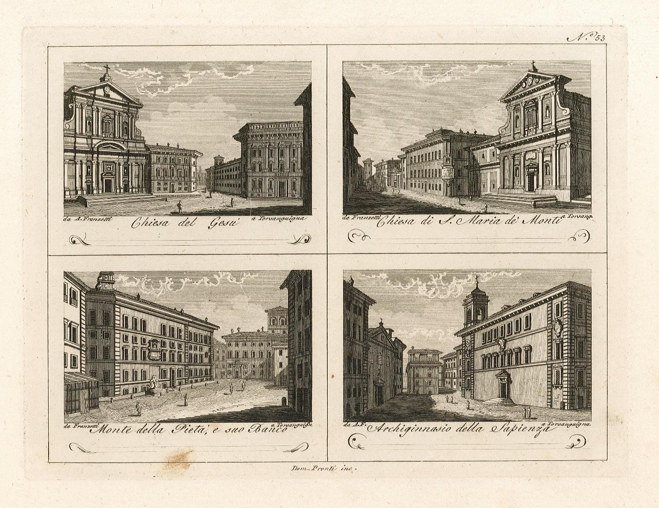 Stampa, antica ed originale, con quattro piccole vedute incise a bulino, caratterizzate da un segno piuttosto incisivo con forti chiaroscuri. Autore: Pronti Domenico inc. Luogo: Roma. Anno: 1820 ca. Tecnica: incisione a bulino. Dimensioni: mm 220x270 ca il foglio.