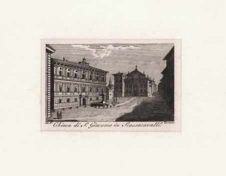 Veduta tratta dalla celebre Raccolta di num. 320 Vedute sì antiche, che moderne della città di Roma. …Incise a bulino in N. 80 rami, In Roma Nella Calcografia di Agapito Franzetti a Torsanguigna Col Permesso. ' L’opera si compone di un frontespizio calcografico e di 80 tavole numerate, ognuna composta da quattro vedute. Viene stampata senza data; molti repertori la datano intorno al 1790 circa, forse perché stampata su carta vergata. Una datazione intorno al 1800 ci sembra tuttavia più plausibile. ' Agapito Franzetti, calcografo attivo a Roma con bottega tra via del Corso e Torsanguigna, è noto per le sue piccole incisioni di veduta che servivano spesso come biglietti da visita. Tutte contengono, infatti, una linea in basso, dove si poteva apporre il proprio nome ad inchiostro. Come indicato nel titolo, le vedute raffigurano sia monumenti e antiche rovine che vedute “moderne”, con piazze, chiese e ville. Ciascuna tavola reca, in basso al centro, il nome dell’incisore. Gli artisti coinvolti sono sei: Jean-Jerome Baugean; Antonio Giuseppe Barbazza; Giovanni Battista Cipriani; Francesco Morelli; Antonio Poretta e Domenico Pronti. Molte delle vedute derivano dalla celebre opera di Giuseppe Vasi, Delle magnificenze di Roma antica e moderna. Pubblicata in 10 volumi dal 1747 al 1761, l’opera presenta 238 incisioni in rame, ciascuna incisione con testo narrativo che fornisce informazioni storiche e documentarie. ' Acquaforte, in buono stato di conservazione. ' Bibliografia: A. Bertarelli, H. Prior, Il biglietto da visita italiano. Cintributo alla storia del costume e dell'incisione nel secolo XVII, Bergamo 1911, p. 162. View of the city printed in Rome by the publisher Agapito Franzetti. Taken from Raccolta di num. 320 Vedute sì antiche, che moderne della città di Roma. …Incise a bulino in N. 80 rami, In Roma Nella Calcografia di Agapito Franzetti a Torsanguigna Col Permesso. ' The work consists of an intaglio frontispiece and 80 numbered plates, each consisting of four views. It is printed without date; many repertories date it around 1790, perhaps because it was printed on laid paper. A date around 1800 seems more plausible. Franzetti, a chalcographer working in Rome with a workshop between Via del Corso and Torsanguigna, is known for his small engravings of views that were often used as business cards. They all contain a line at the bottom where one's name could be written in ink. The small views were often printed four to a sheet. As indicated in the title, the views depict both monuments and ancient ruins and "modern" views, with squares, churches and villas. Each table bears, at the bottom center, the name of the engraver. There are six artists involved: Jean-Jerome Baugean; Antonio Giuseppe Barbazza; Giovanni Battista Cipriani; Francesco Morelli; Antonio Poretta and Domenico Pronti. ' The views are made after Giuseppe Vasi’s monumental work Delle magnificenze di Roma antica e moderna. Published in 10 volumes from 1747 to 1761, the work features 238 copper engravings, each engraving with a narrative text that provides historical and documentary information. ' Bibliografia: A. Bertarelli, H. Prior, Il biglietto da visita italiano. Contributo alla storia del costume e dell'incisione nel secolo XVII, Bergamo 1911, p. 162. Cfr.