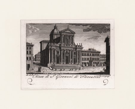 Veduta tratta dalla celebre Raccolta di num. 320 Vedute sì antiche, che moderne della città di Roma. …Incise a bulino in N. 80 rami, In Roma Nella Calcografia di Agapito Franzetti a Torsanguigna Col Permesso. ' L’opera si compone di un frontespizio calcografico e di 80 tavole numerate, ognuna composta da quattro vedute. Viene stampata senza data; molti repertori la datano intorno al 1790 circa, forse perché stampata su carta vergata. Una datazione intorno al 1800 ci sembra tuttavia più plausibile. ' Agapito Franzetti, calcografo attivo a Roma con bottega tra via del Corso e Torsanguigna, è noto per le sue piccole incisioni di veduta che servivano spesso come biglietti da visita. Tutte contengono, infatti, una linea in basso, dove si poteva apporre il proprio nome ad inchiostro. Come indicato nel titolo, le vedute raffigurano sia monumenti e antiche rovine che vedute “moderne”, con piazze, chiese e ville. Ciascuna tavola reca, in basso al centro, il nome dell’incisore. Gli artisti coinvolti sono sei: Jean-Jerome Baugean; Antonio Giuseppe Barbazza; Giovanni Battista Cipriani; Francesco Morelli; Antonio Poretta e Domenico Pronti. Molte delle vedute derivano dalla celebre opera di Giuseppe Vasi, Delle magnificenze di Roma antica e moderna. Pubblicata in 10 volumi dal 1747 al 1761, l’opera presenta 238 incisioni in rame, ciascuna incisione con testo narrativo che fornisce informazioni storiche e documentarie. ' Acquaforte, in buono stato di conservazione. ' Bibliografia: A. Bertarelli, H. Prior, Il biglietto da visita italiano. Contributo alla storia del costume e dell'incisione nel secolo XVII, Bergamo 1911, p. 162. View of the city printed in Rome by the publisher Agapito Franzetti. Taken from Raccolta di num. 320 Vedute sì antiche, che moderne della città di Roma. …Incise a bulino in N. 80 rami, In Roma Nella Calcografia di Agapito Franzetti a Torsanguigna Col Permesso. ' The work consists of an intaglio frontispiece and 80 numbered plates, each consisting of four views. It is printed without date; many repertories date it around 1790, perhaps because it was printed on laid paper. A date around 1800 seems more plausible. Franzetti, a chalcographer working in Rome with a workshop between Via del Corso and Torsanguigna, is known for his small engravings of views that were often used as business cards. They all contain a line at the bottom where one's name could be written in ink. The small views were often printed four to a sheet. As indicated in the title, the views depict both monuments and ancient ruins and "modern" views, with squares, churches and villas. Each table bears, at the bottom center, the name of the engraver. There are six artists involved: Jean-Jerome Baugean; Antonio Giuseppe Barbazza; Giovanni Battista Cipriani; Francesco Morelli; Antonio Poretta and Domenico Pronti. ' The views are made after Giuseppe Vasi’s monumental work Delle magnificenze di Roma antica e moderna. Published in 10 volumes from 1747 to 1761, the work features 238 copper engravings, each engraving with a narrative text that provides historical and documentary information. ' Bibliografia: A. Bertarelli, H. Prior, Il biglietto da visita italiano. Contributo alla storia del costume e dell'incisione nel secolo XVII, Bergamo 1911, p. 162. Cfr.