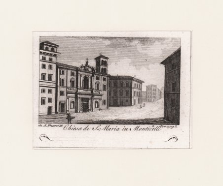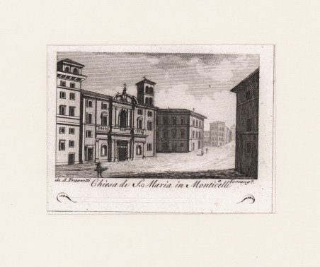 Veduta tratta dalla celebre Raccolta di num. 320 Vedute sì antiche, che moderne della città di Roma. …Incise a bulino in N. 80 rami, In Roma Nella Calcografia di Agapito Franzetti a Torsanguigna Col Permesso. ' L’opera si compone di un frontespizio calcografico e di 80 tavole numerate, ognuna composta da quattro vedute. Viene stampata senza data; molti repertori la datano intorno al 1790 circa, forse perché stampata su carta vergata. Una datazione intorno al 1800 ci sembra tuttavia più plausibile. ' Agapito Franzetti, calcografo attivo a Roma con bottega tra via del Corso e Torsanguigna, è noto per le sue piccole incisioni di veduta che servivano spesso come biglietti da visita. Tutte contengono, infatti, una linea in basso, dove si poteva apporre il proprio nome ad inchiostro. Come indicato nel titolo, le vedute raffigurano sia monumenti e antiche rovine che vedute “moderne”, con piazze, chiese e ville. Ciascuna tavola reca, in basso al centro, il nome dell’incisore. Gli artisti coinvolti sono sei: Jean-Jerome Baugean; Antonio Giuseppe Barbazza; Giovanni Battista Cipriani; Francesco Morelli; Antonio Poretta e Domenico Pronti. Molte delle vedute derivano dalla celebre opera di Giuseppe Vasi, Delle magnificenze di Roma antica e moderna. Pubblicata in 10 volumi dal 1747 al 1761, l’opera presenta 238 incisioni in rame, ciascuna incisione con testo narrativo che fornisce informazioni storiche e documentarie. ' Acquaforte, in buono stato di conservazione. ' Bibliografia: A. Bertarelli, H. Prior, Il biglietto da visita italiano. Contributo alla storia del costume e dell'incisione nel secolo XVII, Bergamo 1911, p. 162. View of the city printed in Rome by the publisher Agapito Franzetti. Taken from Raccolta di num. 320 Vedute sì antiche, che moderne della città di Roma. …Incise a bulino in N. 80 rami, In Roma Nella Calcografia di Agapito Franzetti a Torsanguigna Col Permesso. ' The work consists of an intaglio frontispiece and 80 numbered plates, each consisting of four views. It is printed without date; many repertories date it around 1790, perhaps because it was printed on laid paper. A date around 1800 seems more plausible. Franzetti, a chalcographer working in Rome with a workshop between Via del Corso and Torsanguigna, is known for his small engravings of views that were often used as business cards. They all contain a line at the bottom where one's name could be written in ink. The small views were often printed four to a sheet. As indicated in the title, the views depict both monuments and ancient ruins and "modern" views, with squares, churches and villas. Each table bears, at the bottom center, the name of the engraver. There are six artists involved: Jean-Jerome Baugean; Antonio Giuseppe Barbazza; Giovanni Battista Cipriani; Francesco Morelli; Antonio Poretta and Domenico Pronti. ' The views are made after Giuseppe Vasi’s monumental work Delle magnificenze di Roma antica e moderna. Published in 10 volumes from 1747 to 1761, the work features 238 copper engravings, each engraving with a narrative text that provides historical and documentary information. ' Bibliografia: A. Bertarelli, H. Prior, Il biglietto da visita italiano. Contributo alla storia del costume e dell'incisione nel secolo XVII, Bergamo 1911, p. 162. Cfr.