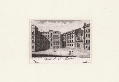 Veduta tratta dalla celebre Raccolta di num. 320 Vedute sì antiche, che moderne della città di Roma. …Incise a bulino in N. 80 rami, In Roma Nella Calcografia di Agapito Franzetti a Torsanguigna Col Permesso. ' L’opera si compone di un frontespizio calcografico e di 80 tavole numerate, ognuna composta da quattro vedute. Viene stampata senza data; molti repertori la datano intorno al 1790 circa, forse perché stampata su carta vergata. Una datazione intorno al 1800 ci sembra tuttavia più plausibile. ' Agapito Franzetti, calcografo attivo a Roma con bottega tra via del Corso e Torsanguigna, è noto per le sue piccole incisioni di veduta che servivano spesso come biglietti da visita. Tutte contengono, infatti, una linea in basso, dove si poteva apporre il proprio nome ad inchiostro. Come indicato nel titolo, le vedute raffigurano sia monumenti e antiche rovine che vedute “moderne”, con piazze, chiese e ville. Ciascuna tavola reca, in basso al centro, il nome dell’incisore. Gli artisti coinvolti sono sei: Jean-Jerome Baugean; Antonio Giuseppe Barbazza; Giovanni Battista Cipriani; Francesco Morelli; Antonio Poretta e Domenico Pronti. Molte delle vedute derivano dalla celebre opera di Giuseppe Vasi, Delle magnificenze di Roma antica e moderna. Pubblicata in 10 volumi dal 1747 al 1761, l’opera presenta 238 incisioni in rame, ciascuna incisione con testo narrativo che fornisce informazioni storiche e documentarie. ' Acquaforte, in buono stato di conservazione. ' Bibliografia: A. Bertarelli, H. Prior, Il biglietto da visita italiano. Contributo alla storia del costume e dell'incisione nel secolo XVII, Bergamo 1911, p. 162. View of the city printed in Rome by the publisher Agapito Franzetti. Taken from Raccolta di num. 320 Vedute sì antiche, che moderne della città di Roma. …Incise a bulino in N. 80 rami, In Roma Nella Calcografia di Agapito Franzetti a Torsanguigna Col Permesso. ' The work consists of an intaglio frontispiece and 80 numbered plates, each consisting of four views. It is printed without date; many repertories date it around 1790, perhaps because it was printed on laid paper. A date around 1800 seems more plausible. Franzetti, a chalcographer working in Rome with a workshop between Via del Corso and Torsanguigna, is known for his small engravings of views that were often used as business cards. They all contain a line at the bottom where one's name could be written in ink. The small views were often printed four to a sheet. As indicated in the title, the views depict both monuments and ancient ruins and "modern" views, with squares, churches and villas. Each table bears, at the bottom center, the name of the engraver. There are six artists involved: Jean-Jerome Baugean; Antonio Giuseppe Barbazza; Giovanni Battista Cipriani; Francesco Morelli; Antonio Poretta and Domenico Pronti. ' The views are made after Giuseppe Vasi’s monumental work Delle magnificenze di Roma antica e moderna. Published in 10 volumes from 1747 to 1761, the work features 238 copper engravings, each engraving with a narrative text that provides historical and documentary information. ' Bibliografia: A. Bertarelli, H. Prior, Il biglietto da visita italiano. Contributo alla storia del costume e dell'incisione nel secolo XVII, Bergamo 1911, p. 162. Cfr.