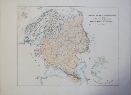 Carta geografica raffigurante le legazioni ecclesiastiche della regione, tratta dall’Orbe Cattolico ' di Girolamo Petri. L'Orbe Cattolico ossia Atlante Geografico Storico Ecclesiastico ' fu pubblicato a Roma in 3 volumi nel 1858-1859. Le mappe di grande formato sono finemente incise e ben colorate. È senza dubbio una delle opere più finemente incise ed eleganti della metà del XIX secolo. Ogni mappa mostra le varie diocesi, ognuna delle quali è contraddistinta da colori vivaci che ne segnano la sede, e altre città importanti. Sebbene le caratteristiche geografiche siano chiaramente espresse, le mappe sono volutamente piuttosto scarne di dettagli, in modo da non sminuire visivamente il loro scopo, che è quello di mostrare le divisioni ecclesiastiche. Nel creare l'atlante, Petri ha sottolineato di aver attinto solo alle "fonti più attendibili", comprese le mappe degli archivi vaticani e delle diocesi d'oltremare L'atlante fu pubblicato in un numero molto limitato di esemplari ad uso esclusivo dei cardinali e degli amministratori di alto rango, il che ne spiega la grande rarità odierna. Girolamo Petri (1806 - 1871) fu una figura importante nell'amministrazione della Chiesa cattolica romana durante il regno di Pio IX. Nacque a Onano (Viterbo, Lazio), figlio di un funzionario vaticano che in seguito divenne governatore di Frascati. Il lavoro di Petri fu svolto in un periodo in cui la Chiesa era sotto assedio in Europa, ma, al contrario, aveva grandi ambizioni di espansione all'estero, in particolare in Asia e in Africa. La metà del XIX secolo fu un periodo di grandi cambiamenti a Roma. L'atlante faceva senza dubbio parte degli ultimi sforzi del Vaticano per comprendere e controllare la sua vasta influenza in tutto il mondo, resuscitando il concetto popolare di province ecclesiastiche diffuso nelle opere di Nicolas Sanson e altri cartografi del XVII secolo. La Calcografia Nazionale (Istituto per la Grafica) conserva ancora 135 rami di questo rarissimo atlante. Incisione in rame, coloritura coeva, in ottimo stato di conservazione. Bibliografia Walter Goffart, ' Historical Atlases: The First Three Hundred Years, 1570-1870 ' (Chicago, 2003), p. 427-8; J.A.B. Jongeneel, ' Philosophy, Science, and Theology of Mission in the 19th and 20th Centuries: A Missiological Encyclopedia ' (1995), p. 264. A very rare map showing the dioceses of Catholic organization, taken from ' L'Orbe Cattolico ' by Girolamo Petri. L’Orbe Cattolico ossia Atlante Geografico Storico Ecclesiastico’ ' was published in Rome in 3 volumes in 1858-1859. ' The large-format maps are finely engraved and beautifully colored. The atlas is a testament to the artistry of the engravers and the relative indifference of the publisher to the commercial success of the work. It is without question one of the most finely engraved and elegant works of the mid-19th Century. Each map shows the various dioceses, which are each distinguished by their own bright colors, marking their seats, as well as other major towns. While key geographical features are expressed throughout, the maps are otherwise intentionally rather sparing of detail, so as not to visually detract from their purpose, which is the show the ecclesiastical divisions. In creating the atlas, Petri noted that he drew only upon the “most trusted sources”, including maps from the Vatican archives and overseas dioceses. The atlas was by far and away the finest ecclesiastical atlas created during the 19th Century, featuring exceptionally beautiful examples of thematic cartography. The uncommonly beautiful atlas was published in only a very small number of examples for the exclusive use of Cardinals and high-ranking administrators, accounting for the great rarity today. Petri who was commissioned by Pope Pius XI thus created during a time when the Church was under siege within Europe, but, conversely, while it had major ambitions for expansion overseas, particularly in Asia and Africa. The mid-19th Century was a period of dramatic change in Rome. The atlas was no doubt part of the Vatican's last-ditch efforts to understand and control its vast influence around the world, resurrecting the popular concept of ecclesiastical provinces popularized in works by Nicholas Sanson and others during the 17th Century. The Calcografia Nazionale still preserves 135 copperplates of this extremely rare atlas. Bibliografia Walter Goffart, ' Historical Atlases: The First Three Hundred Years, 1570-1870 ' (Chicago, 2003), p. 427-8; J.A.B. Jongeneel, ' Philosophy, Science, and Theology of Mission in the 19th and 20th Centuries: A Missiological Encyclopedia ' (1995), p. 264. Cfr.