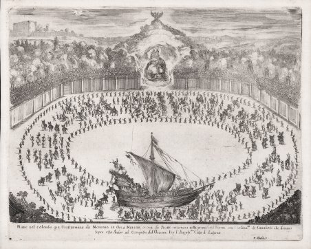 Acquaforte 1652, nel margine inferiore: Nave Del Colombo gia Trasformata da Nettuno in Orca Marina, et ora da Proteo ritornata nella prima sua Forma con l'ordina.za dei Cavalieri che devano/ sopra essa Andar al Conquisto dell'Oriente per l'August.ma Casa d'Austria e, più in basso D ' Bella. Ordinato dal Granduca Ferdinando II di Toscana e concepito da Tommaso Guidoni, il balletto fu eseguito nell'anfiteatro del giardino di Boboli. Alfonso Parigi disegnò i costumi, le decorazioni e il carro di Nettuno. Ferdinando Tacca disegnò il carro del mostro marino. Le impressioni dell'incisione furono pubblicate con il poema in versi di Benedetto Rigogli in: Combattimento e balletto a cavallo rappresentato di notte in Fiorenza . (Firenza : Nella stamperia di S.A.S. alla Condotta, 1652). La stampa raffigura il balletto a cavallo noto come Proteo e Fama, eseguito a Firenze la sera del 28 aprile 1652 in onore della visita di Anna de' Medici, Ferdinando Carlo d'Austria e Sigmund Franz d'Austria; fanti, tedofori e cavalieri marciano nell'arena, scortando la nave di Cristoforo Colombo. Sullo sfondo, un mostro marino emerge da un monte ornato da un'aquila a due teste; la firma dell'incisore è incompleta, con solo le lettere "D Bella" visibili. ' Stefano della Bella fu uno degli incisori più interessanti e originali nella Firenze del XVII secolo e può considerarsi l’unico geniale continuatore dell’opera di Jacques Callot. La sua educazione artistica ebbe inizio a Firenze nella bottega degli orafi Gasparo Mola e Orazio Vanni, e la precisione del segno, tipica dell’arte orafa resterà caratteristica del suo stile. Studiò poi presso Giovanni Battista Vanni e forse anche presso il Cantagallina e Cesare Dandini, ma ben presto si dedicò all'incisione. Il suo vero maestro può considerarsi Jacques Callot, l’incisore francese che soggiornò a lungo a Firenze lasciando una forte impronta nel panorama artistico della città. Gli anni più importanti della sua carriera sono quelli che trascorre a Parigi, dal 1639 al 1650, stipendiato da Lorenzo de' Medici: lavorò insieme ad Israel Silvestre, con gli editori Langlois, Ciartres e Pierre Mariette, per stampatori francesi e per commissioni di gran prestigio, come quelle del 1641 per il cardinale Richelieu che gli affidò le illustrazioni delle sue imprese guerresche. Intorno al 1647, durante un viaggio in Olanda, dove eseguì le acqueforti con le vedute del porto di Amsterdam, incontrò Rembrandt e da quella data notiamo una eco profonda dell’arte dell’olandese nella grafica del Della Bella. ' Bellissima prova di questa rara incisione, impressa su carta vergata con filigrana “le tre rocce” (simile a Lieure 4), con margini, in perfette condizioni.Timbro di collezione al verso sconosciuto al Lugt. Bibliografia De Vesme - Massar Stefano della Bella (1971) n. 66; “Il luogo teatrale a Firenze” 11.7. Etching, 1652, signed at lower right. After Alfonso Parigi. In lower margin: ' Naue del Colonbo gia trasformata da Nettunno in orca marina, et ora da Proteo ritornata nella prima sua forma con l'ordina.za de caualieri che deuano sopra essa andar al conquisto del Oriente per l'august.ma casa d'Austria A fine impression, printed on contemporary laid paper with "three rocks" watermark (close to Lieure 4), with margins, perfect condition. Ordered by Grand Duke Ferdinando II of Tuscany and conceived by Tommaso Guidoni, the ballet was performed in the amphitheater of the Boboli gardens. Alfonso Parigi designed the costumes, the decorations, and the float of Neptune. Ferdinando Tacca designed the float of the sea monster; Impressions of the etching were issued with Benedetto Rigogli's poem in verse in: Combattimento e balletto a cavallo rappresentato di notte in Fiorenza . (In Fiorenza : Nella stamperia di S.A.S. alla Condotta, 1652). The print depicts the horse ballet known as Proteo e Fama, performed in Florence on the evening of April 28, 1652 in honor of the visit of Anna de' Medici, Ferdinand Karl of Austria and Sigmund Franz of Austria; Infantrymen, torchbearers, and cavaliers are shown marching in the arena, escorting the ship of Christopher Columbus. In the background, a sea monster emerges from a mount adorned with a double-headed eagle; The etcher's signature is incomplete, with only the faint letters "D Bella" visible. Unknown colection mark, on verso. Stefano della Bella was one of the most interesting and original engravers in 17th-century Florence and can be considered the only brilliant continuator of Jacques Callot's work. His artistic education began in Florence in the workshop of the goldsmiths Gasparo Mola and Orazio Vanni, and the precision of sign, typical of the goldsmith's art, will remain characteristic of his style. He then studied under Giovanni Battista Vanni and perhaps also under Cantagallina and Cesare Dandini, but soon turned to engraving. His real master can be considered Jacques Callot, the French engraver who stayed in Florence for a long time and left a strong imprint on the city's artistic scene. The most important years of his career were the ones he spent in Paris, from 1639 to 1650, salaried by Lorenzo de' Medici: he worked together with Israel Silvestre, with the publishers Langlois, Ciartres and Pierre Mariette, for French printers and for commissions of great prestige, such as those of 1641 for Cardinal Richelieu, who entrusted him with illustrations of his warlike exploits. Around 1647, during a trip to Holland, where he executed etchings with views of the port of Amsterdam, he met Rembrandt, and from that date we note a profound echo of the Dutchman's art in Della Bella's graphic work. Bibliografia De Vesme - Massar Stefano della Bella (1971) n. 66; “Il luogo teatrale a Firenze” 11.7. Cfr.
